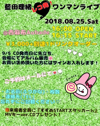 こんばんは!! りおです。 元気です。 超特急な報告します✧*。 8.25.どようび レコ発ライブ!! 『レコ発』の響き なんて甘美な響き!笑 憧れのレコ発ライブ!というやつ! ワンマンライブ、します♡ ご支援いただいた皆様、 ライブ招待コースには申し込まなかったけれど、 ちょっと行けそうだぞ。。。 せっかくだから、生歌も聴いてやろう。。 そんなスーパークルーがいらっしゃいましたら、ぜひ! https://twitter.com/rio_melolip/status/1011543035430096896?s=21 ↑このリンク先のツイート記載のアドレスへ、 お名前(ふりがなも)、枚数、連絡先(電話番号) を書いてメール下さいませ…! 西麻布Aubade、なんと地上!ライブをやる場所〜にしてはきっと!レア!(ですよね??)二階にあるのです! ライブとか行ったことない。。 こわそう。。 そんな方にもゆっくり安心してご覧いただけるオシャレな場所です♡ 気軽に遊びに来てください!! きらっ✧*。 ※これが言いたいがために、この記事は全体公開です♡笑 さて、日曜日はレコーディング3回目でした。 すすめSTARTスタッカート、 アルバム用に、キーを上げてレコーディングし直しております! しかし、YouTubeのデモ、一生懸命つくったので。。 ライブに来てくれた方々には、YouTubeで公開していたキーのフルバージョン音源のCD(りおが焼くので、超簡易的パケですが…;))をプレゼントしちゃいます!! わーい! さらに、さらに、 レコ発ライブ!ということは 9/5 発売日に先駆けて、 ライブ物販で出来たてホヤホヤアルバム!販売します!! その場でご購入いただいた方には、もちろんCDにサインを入れます…!! スーパークルーズの皆様のうち、ライブに御来場いただける方には、その場でリターングッズと合わせてお手渡しさせて頂けたら嬉しいです! もちろん、ライブは行けないけど支援したよぉ〜!というスーパークルーズのみなさま! ご安心ください。。! ご支援いただいた方々のお手元に最速でお届けするつもりでおりますので!! りおが1人でグッズを制作し、 手紙を書き、 チェキを撮り、 梱包し。。 発送し。。 というシステムゆえに、 少々、格闘いたしますので、 御来場いただけるスーパークルーズには お手渡しをゆるしていただけると、とっても嬉しいのです(*ฅ́˘ฅ̀*);; 甘えてばかりで申し訳ありません。゚ヽ(゚´ω`゚。ヽ) いま、着々とグッズ制作もすすめておりますので、 そちらもまたりおの手元に納品され次第、限定公開記事で(๑•ω•๑)♡チラ見せしますね!! お楽しみに・:*+.\(( °ω° ))/.:+ ※エコバッグ、バッテリーにつきましては、 りおがデザイン入稿後、制作サイト様からの直送となります〜! 慌ただしくわーっっ と書いてしまいましたが ワクワク、ドキドキ 伝わっておりますでしょうか♡ レコーディングのレポが少なめになりましたが笑、 すごく!、いいよ!!! めちゃくちゃ可愛いしかっこいいし、ほんとにきらきらの宝石箱です✧*。٩(´◉౪◉`)و✧*。 人間だから、いい時も悪い時もあるけれど どんな時にも聴いたら、歌ったら元気が出ちゃう 前に進める! そんな曲が詰まっていると思います まだレコーディング残っているの〜!! 駆け込み駆け込み、毎日限りある時間をなんとかうまく使いたく。。。 がんばりーおするから、皆さまの顔を思い浮かべてがんばりーおするから!! 引き続き、楽しみにお待ちください♫꒰・‿・๑꒱ 遅くにごめんねっっ おやすみなさい♡ ᕱ⑅ᕱ♥ 藍田理緒