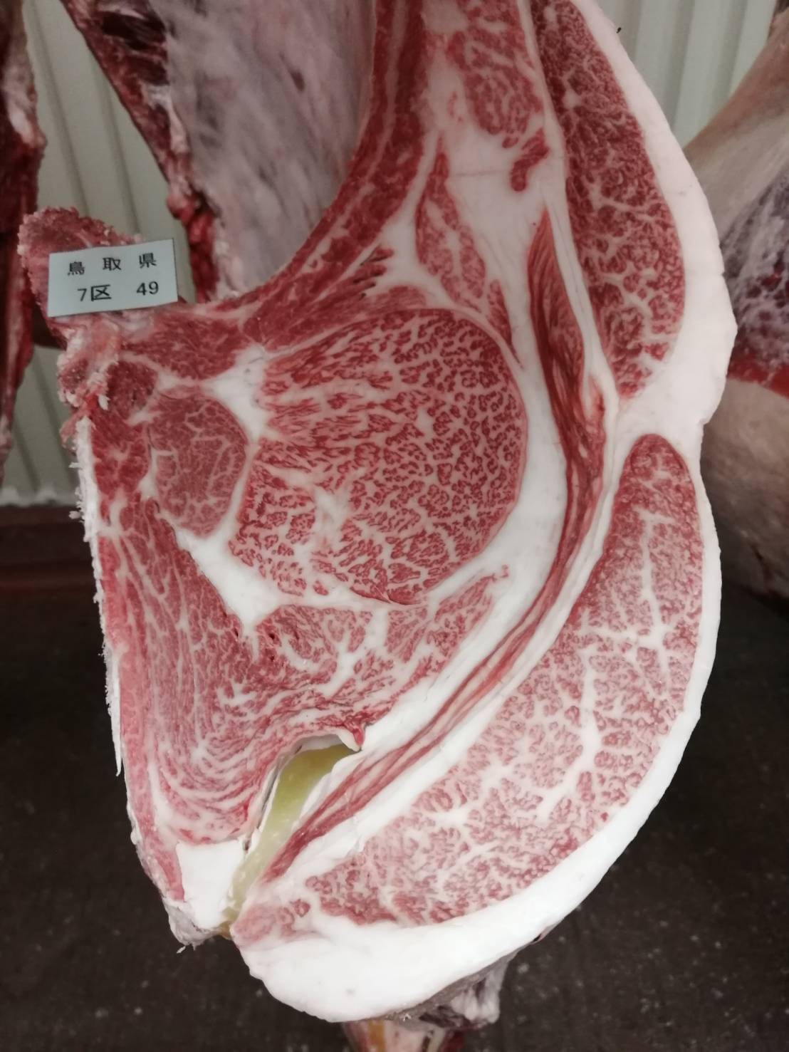 以下、10月初めに鹿児島県で開催された「全国和牛能力共進会」(通称和牛オリンピック)にて、弊社が購買させていただきました鳥取県の出場牛「関鳥白鵬」の枝肉です。素晴らしいロース断面でした。