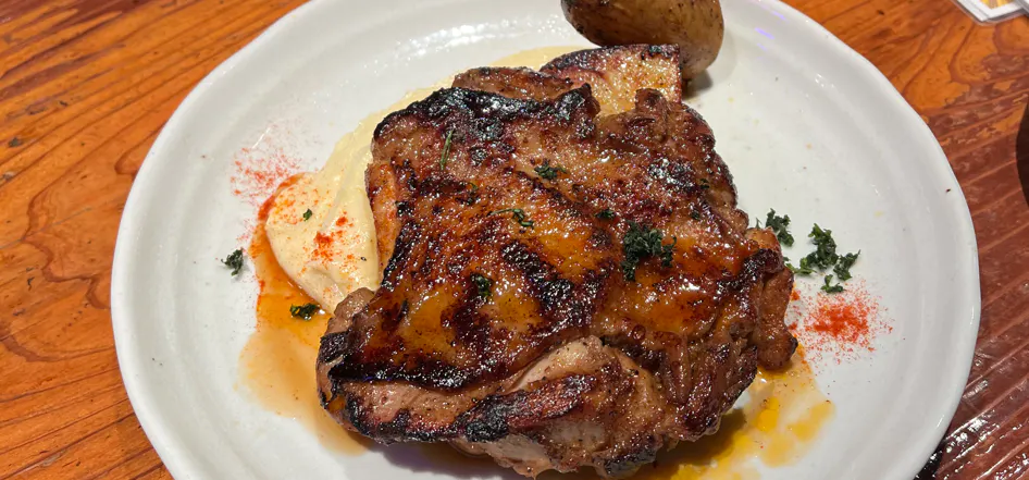 一枚肉を絶妙な焦げを感じるまで焼き上げジューシーなお肉とパリパリの皮を楽しむ至極の一品