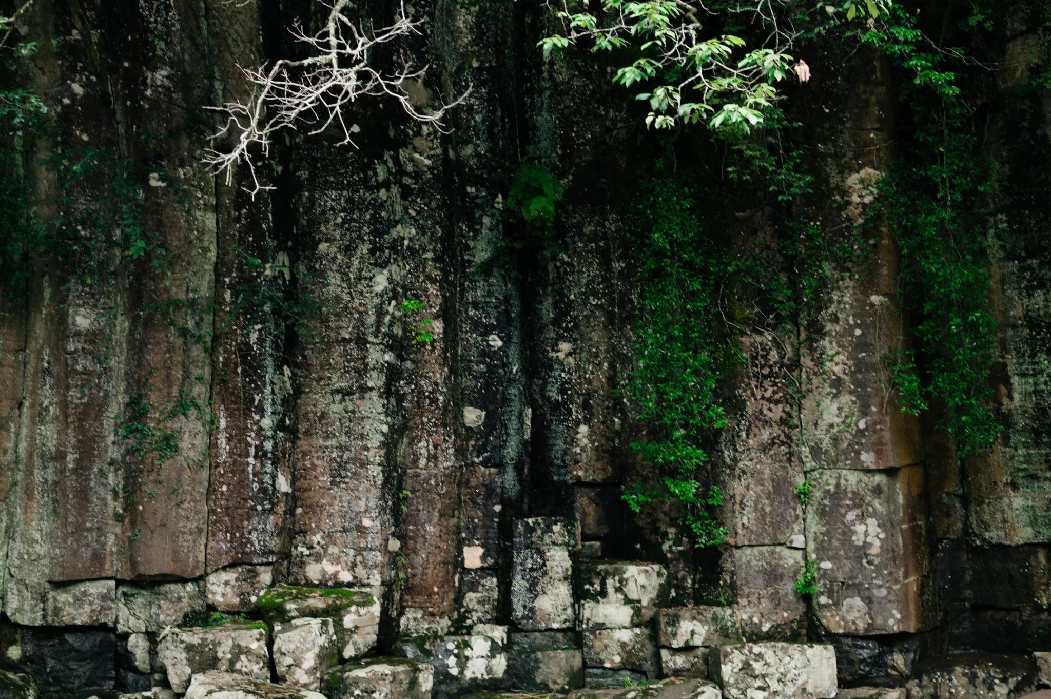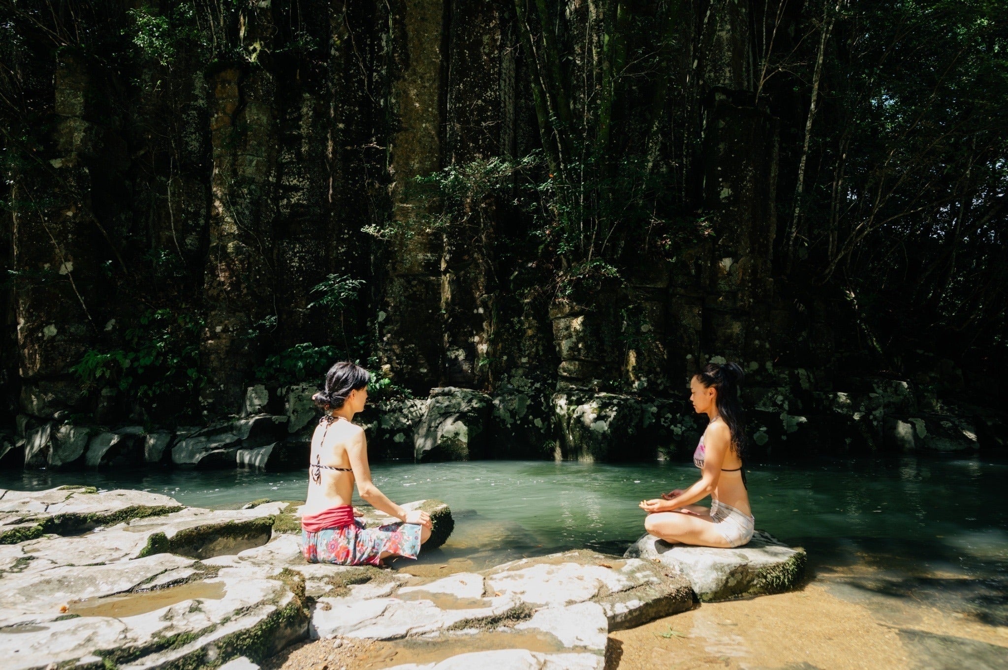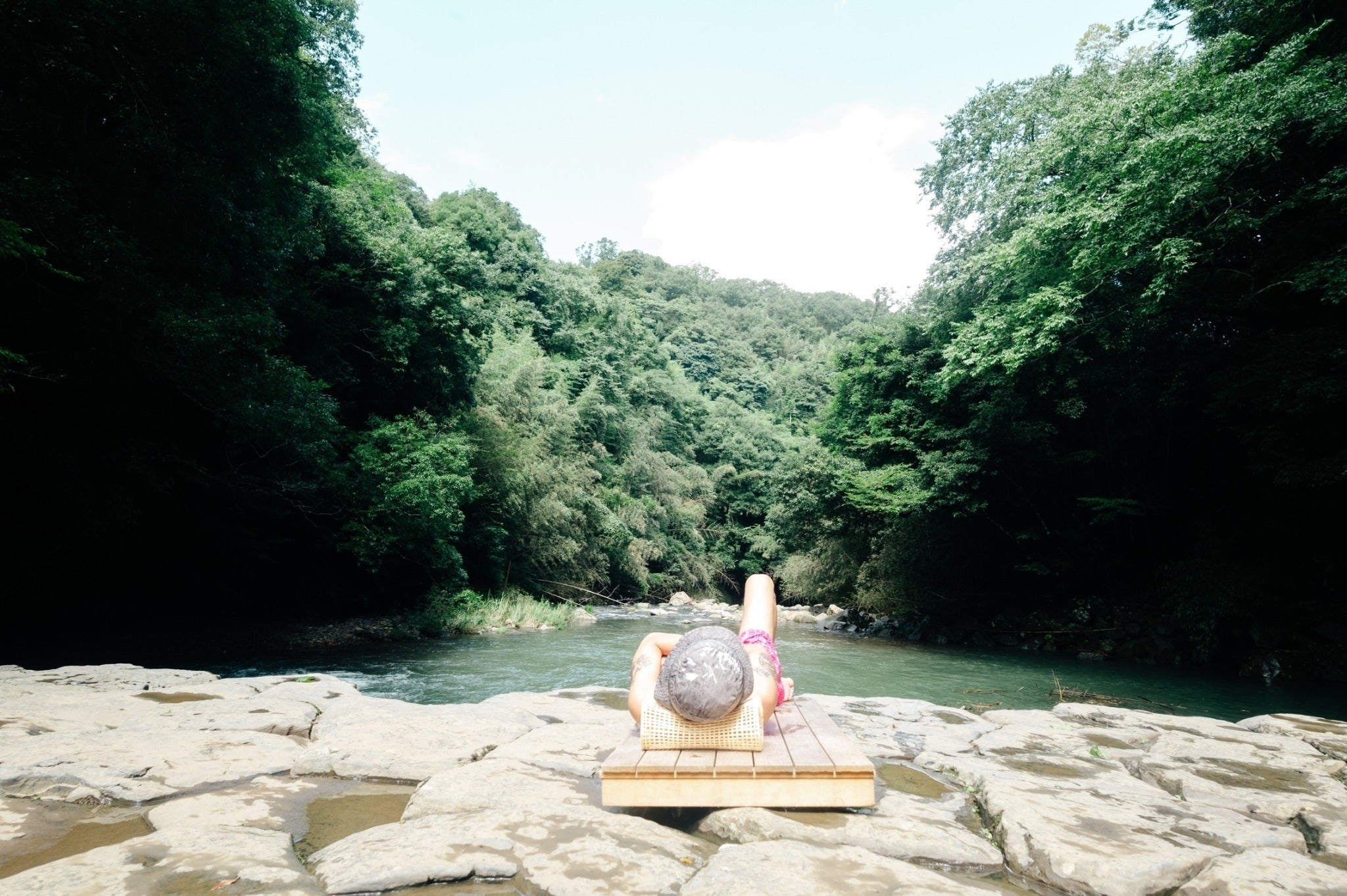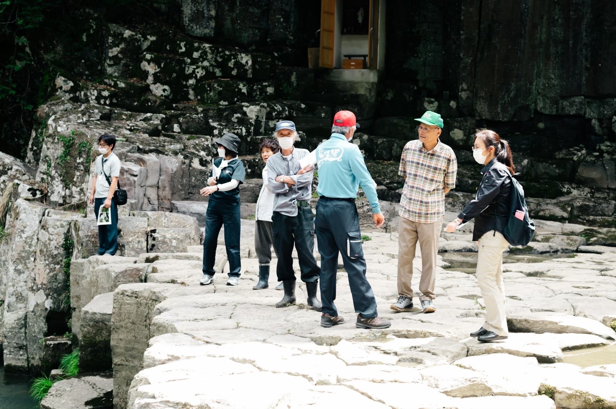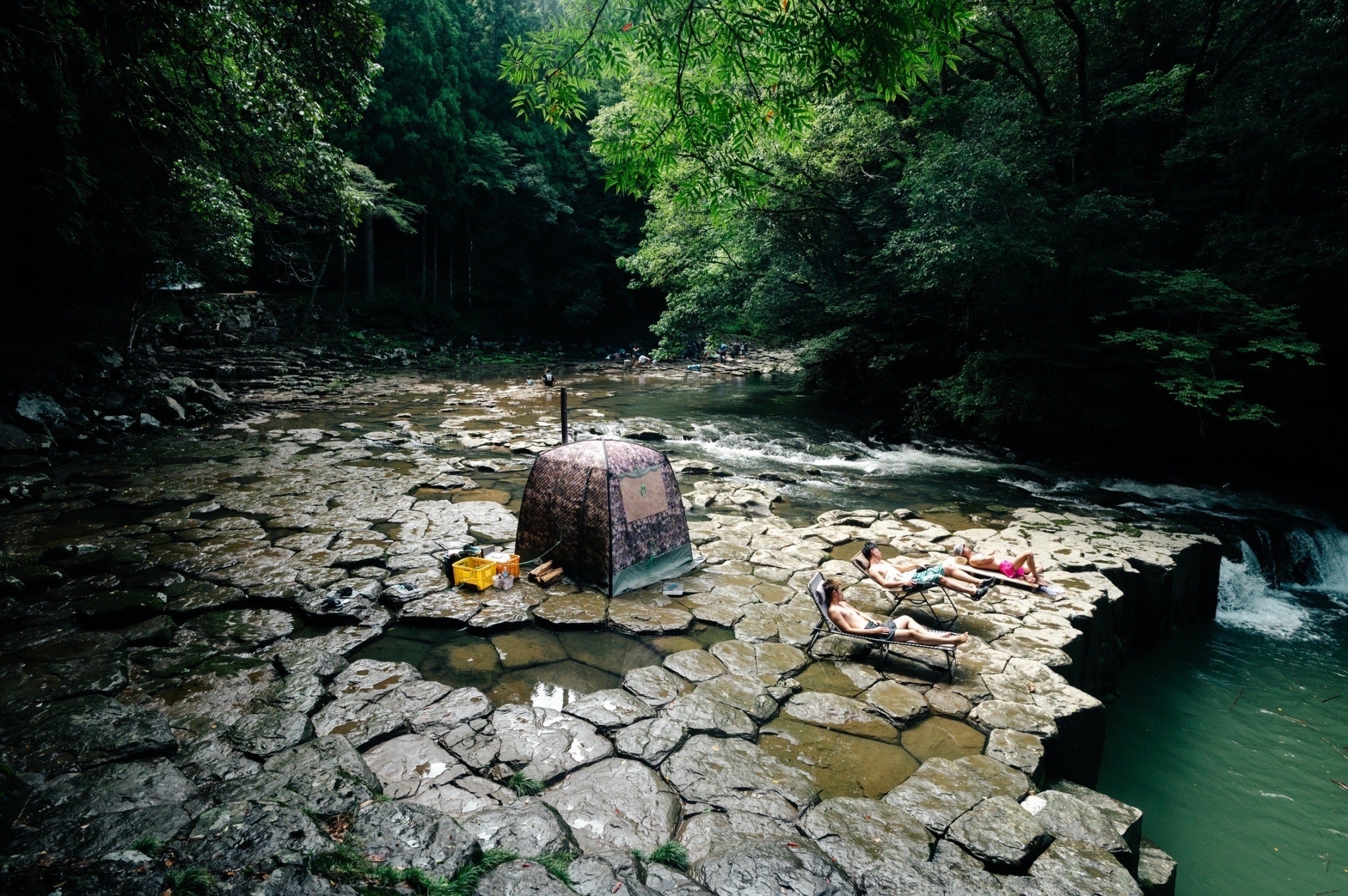 河床に並ぶ亀の甲羅のような岩石と、川岸にそそり立つ柱状節理の柱がとても美しく、周りの木々から降り注ぐ太陽光は神々しさすら感じます。