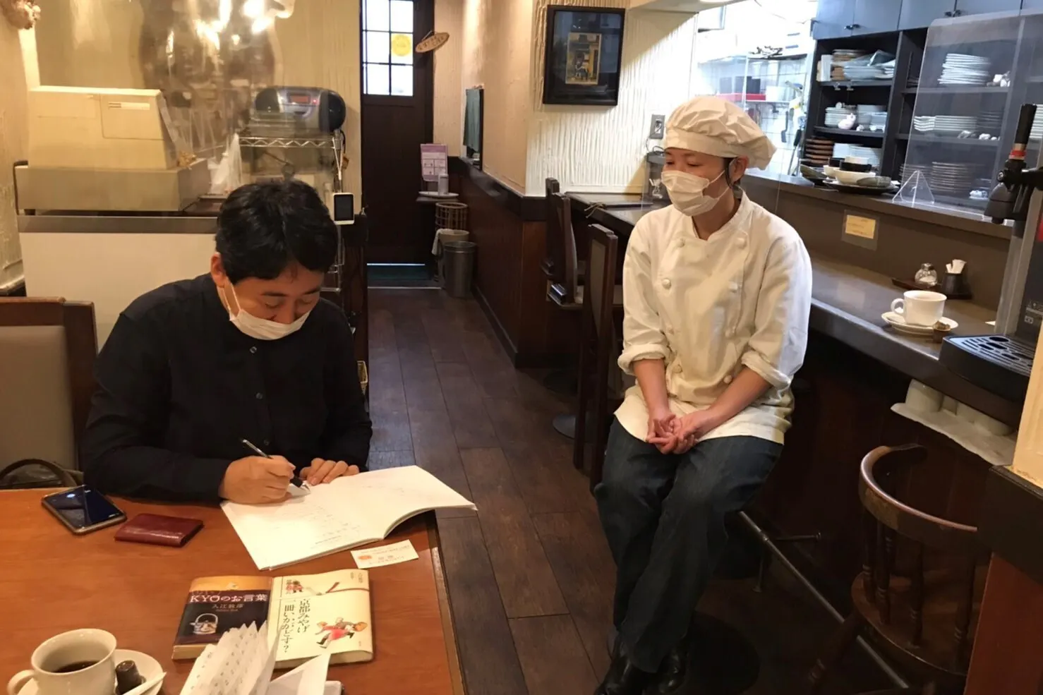 上の写真は、10月27日(木)、円町にある「とんかつ&ステーキ 岡田」の岩﨑智子さん(右)の聞き取りを行った際のものです(本格的に聞き取りに入る前の雑談の場面)。お店を継ぐに至った経緯や料理へのこだわりなど語っていただきました。