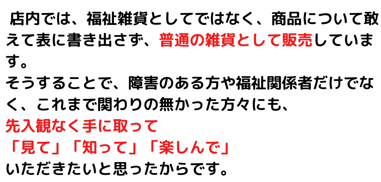 これらは、店主が直接お伺いして商品とそれを作る福祉事業所の雰囲気を見学させていただいた上でセレクトした、障害のある方が作られた商品です。(以下、福祉雑貨と表記)