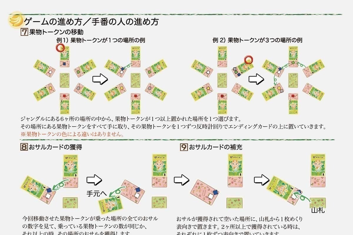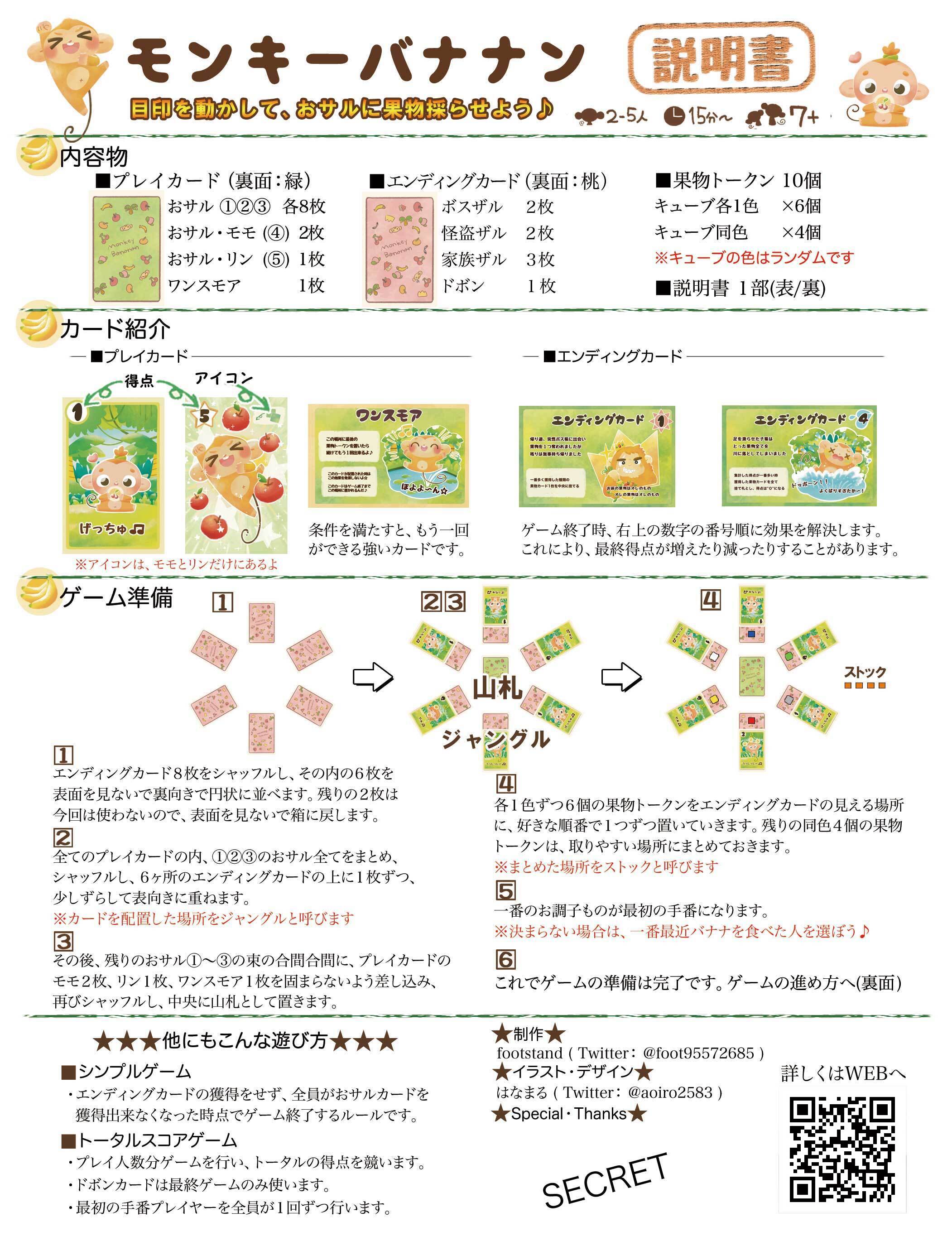 今回、数多く製作した自作ボードゲームの中からモンキーバナナンを選んだ理由は、キャラクタが可愛く、ゲームイメージも、ジャングルの中で目印(果物トークン)を動かして、おサルに果物を採らせるというイメージにピッタリなゲームに仕上がっているからです。