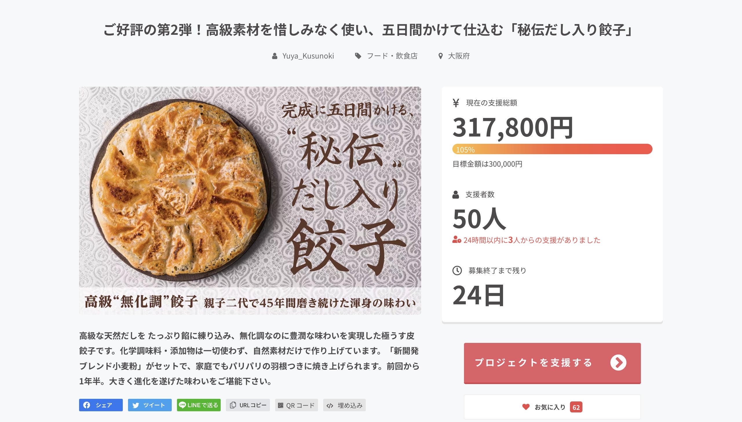 餃子屋本舗 二代目 楠です。先日、スタートしたプロジェクトですが皆様の応援のお陰で無事に100%を達成し、現在151% / 70名の方にご支援をいただきました!現段階でこんなにも沢山の方に応援いただけるとは思っていませんでした。心より嬉しく思っております。1/18(水)にはCampfireのニュースレターで大きく取り上げてもらえますので、早割をご希望の方はそれまでにご検討いただければと思います。■ 追加リターン『 “ 修行中 ” 点心3種類セット 』 100%達成を記念して、単品合計価格 7,360円の点心セットを 32%off 5,000円(税 / 送料込み)でご提供するリターンを追加しました!さらに、20%還元クーポンで更に1,000円分が返ってきます。実質で考えると非常にお得です。なぜ、お得なの?→移転先の環境に慣れるための『修行中価格』餃子屋本舗は北新地へ移転しました。手作りの皮生地は凄くデリケートなので土地ごとの湿度や空調で加水率が変わります。こればかりは計算では割り切れないので、新しい環境で たくさん作って土地のクセを掴む意外に方法はありません。そこで、通常は割引しない点心類を ”修行中価格” としてご提供します。品質は普段のものと変わりないので ご安心ください。3種類セット の中身をご紹介します!■点心セット 1種類目- 霜降りロース豚肉の香味老麺水餃子 ×12個明の時代から700年以上受け継がれてきた天然酵母「老麺」を用いて練り上げる手作り皮の水餃子です。三元豚のリブロースを存在感のある手切りにし、白ネギ、ニラ、生姜を利かせて香り高く仕上げました。茹でるだけで食べられます。■点心セット 2種類目- 極うす皮 小籠包 金華ハムスープ仕立て ×12個中華の高級食材「金華ハム」から煮出した、極上の旨味のスープが溢れる、極うす皮の小籠包です。職人の手技で皮を伸ばし、餡をたっぷりと包み込みました。極薄皮のため、お箸で破かないようにご注意下さい。※調理には蒸し器が必要です。■点心セット 3種類目- 天然大海老としそのもちぷる蒸し餃子 ×12個乱切りにした天然大海老、すり鉢にかけた天然大海老を用いた贅沢な特製餡を使用。しそとエシャロットの広がる香りがアクセント。干しエビの戻し汁で練り上げた、浮き粉とタピオカ粉のモチぷるの手延べ皮は他では味わえません。※調理には蒸し器が必要です。●だし入り餃子との違い今回のメインリターンとしてご用意した「だし入り餃子」は餃子屋本舗の看板メニューで通販でも販売しています。一方、点心類は元々お店では人気のあったものの、大量に作れないので通信販売は今のところしていません。どちらもこだわって作っている商品ですので、是非この機会にお楽しみいただければと思います。●お届け時期について点心セットはゆっくり目の配送とさせていただきます。季節の変化による生地の状態も つかんでおきたいからです。なので、お届け時期は2023年6月までと余裕を持たせてください。順次発送いたしますので、早い方は3月頃からお届けしていきます。●公開日は1/20(金)AM 11時45分 です!ぜひ、この機会に餃子屋本舗で愛されてきた点心も楽しんでみてください。当日もリマインダーとしてお知らせさせていただきます、もし不要な方がいればお気に入り登録を解除しておいてください。よろしくお願いいたします!