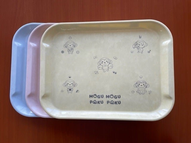 食器の猿の絵と、トレイの猿の絵を合わせることで、正しい配置で食べることが出来ます。