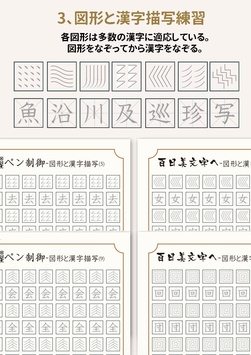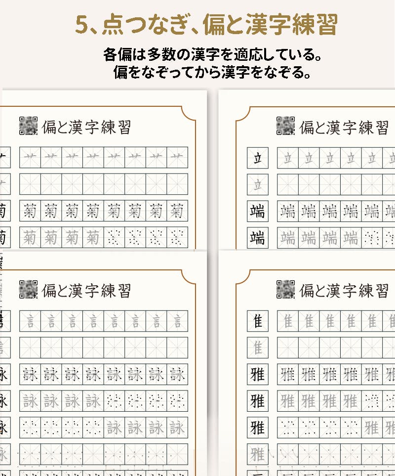 後半には漢字のなぞり練習になっており、練習すれば漢字の構造への理解は深くなりバランス感覚を掴めます。