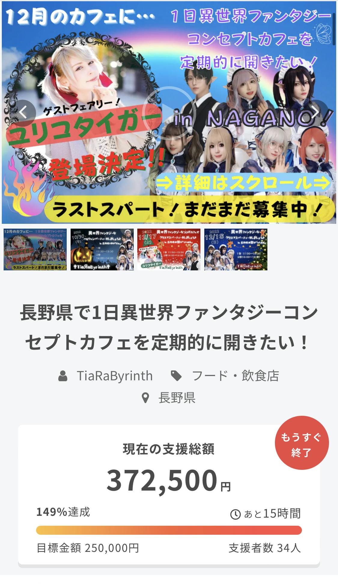 皆様のご協力で、すでにネクストゴールまで達成していますが、11月数枠、12月も入場の枠はまだ埋まっていませんので、ぜひお得な入場チケットやグッズにご支援頂けたら嬉しいです!!