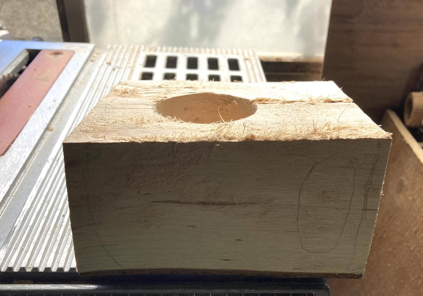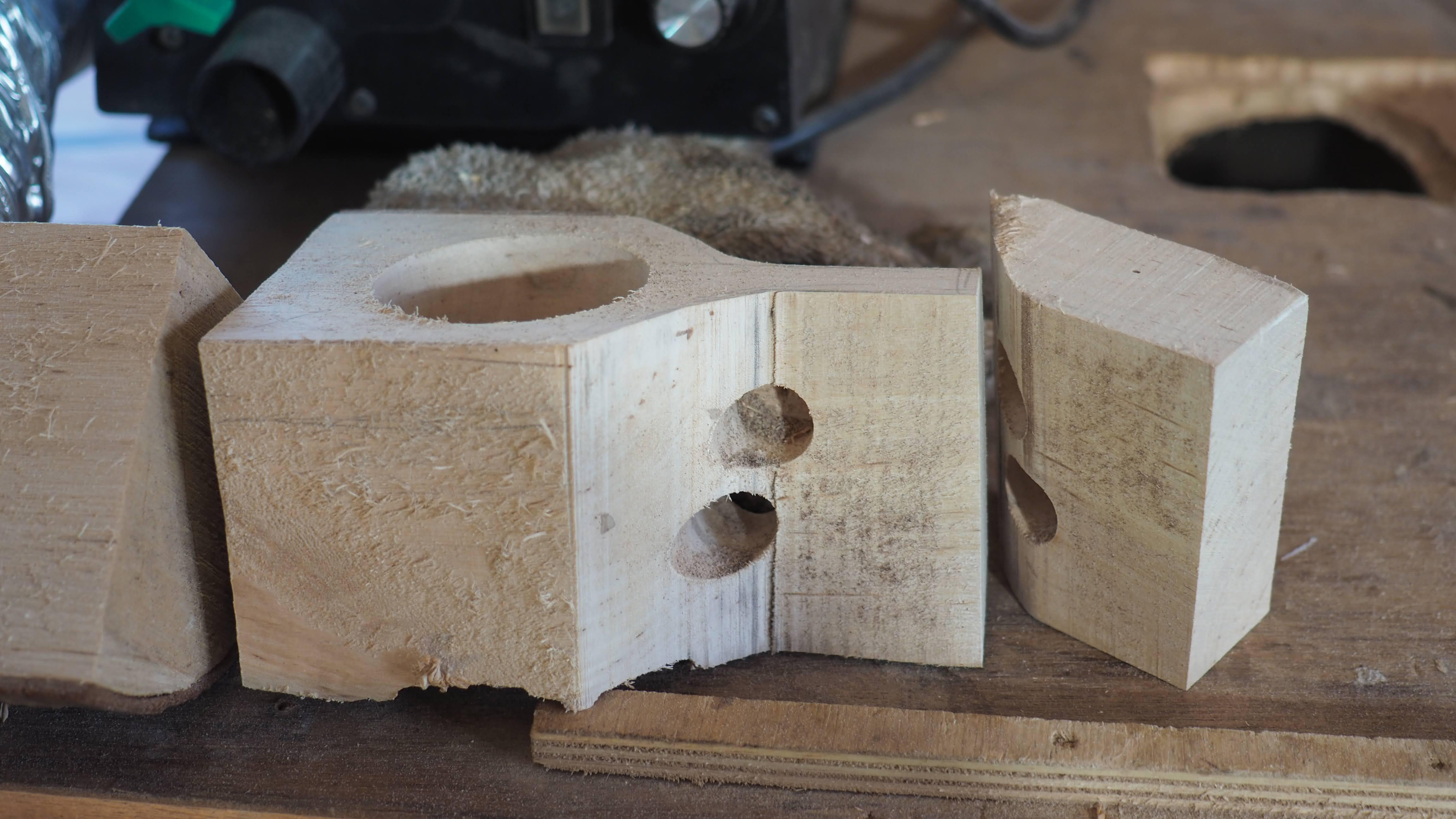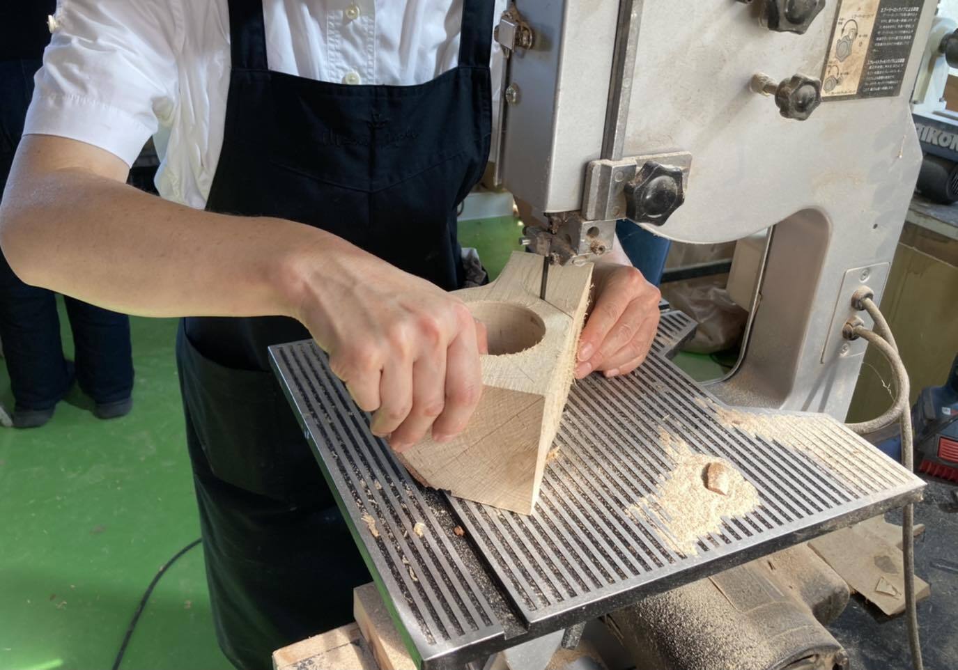 まずは、ククサのもとになる白樺の原木に、ククサの形を思い思いに線引していきます。大体の線が引けたら、それに併せて電動工具をつかって大まかに切り出していきます。まず講師がお手本を示した後は、各自が自分でゆっくりと切り出します。