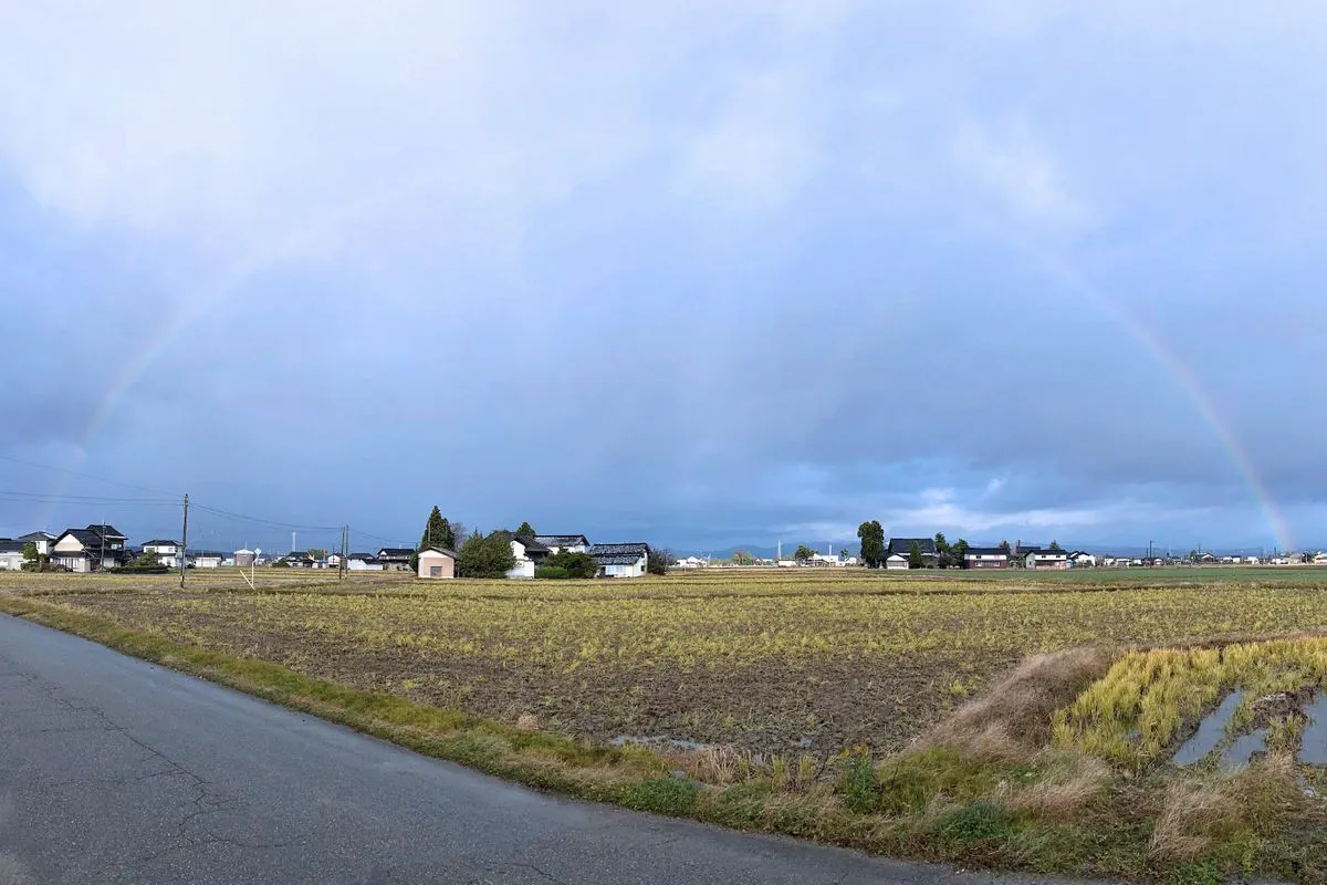 こういう日は、太陽が出た瞬間に虹も良く出ます。東京では、たいていビルの隙間にちょっと見えるだけですが、散居村は高い建物が無いので、虹の端から端まで見ることができます。ちょっと感動します。