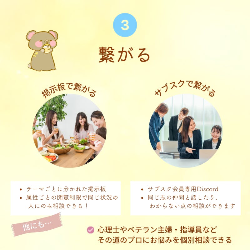 おうちで楽しめるイベントの開催を続けていく一方で、ママが元気でないと子供も幸せにはなれないとの理念から、ママの心身ケアができるよう、サイト上に悩みを吐き出せる掲示板や心理士やカウンセラーへの個別相談を準備します。