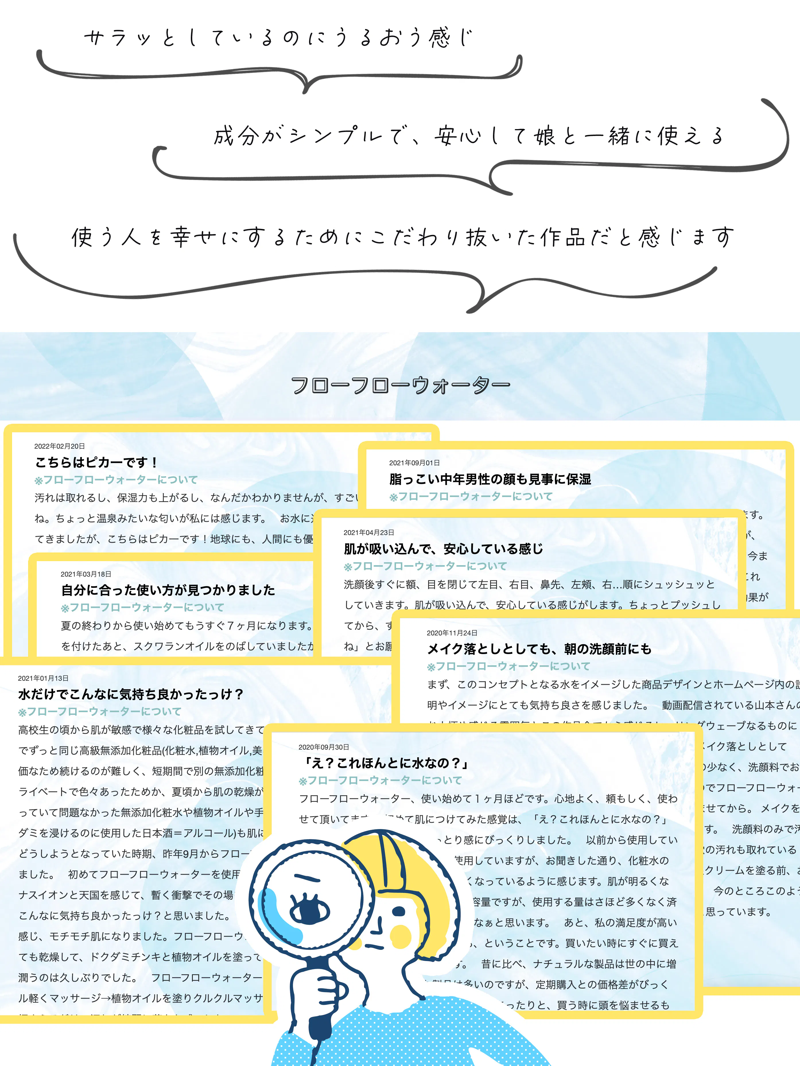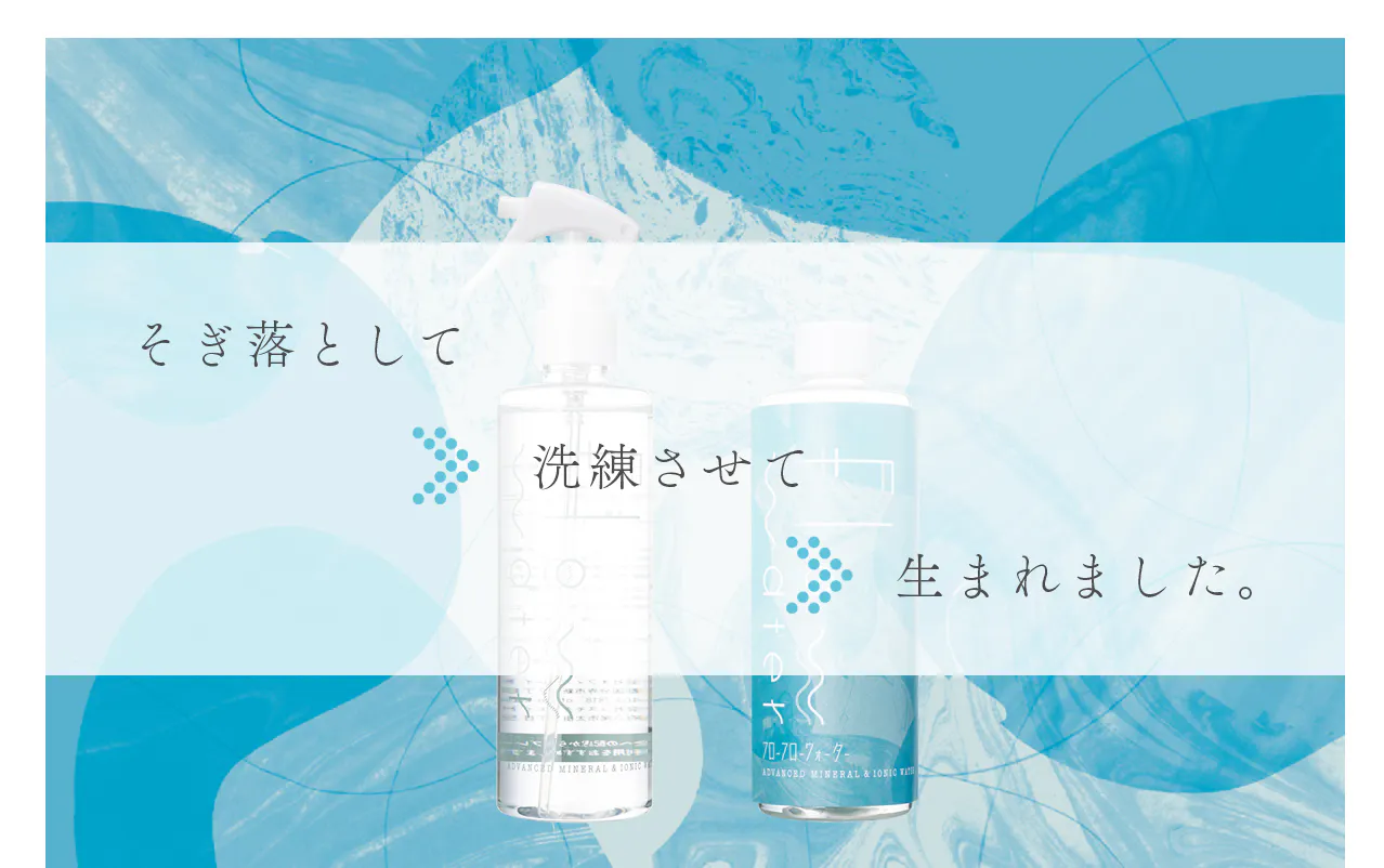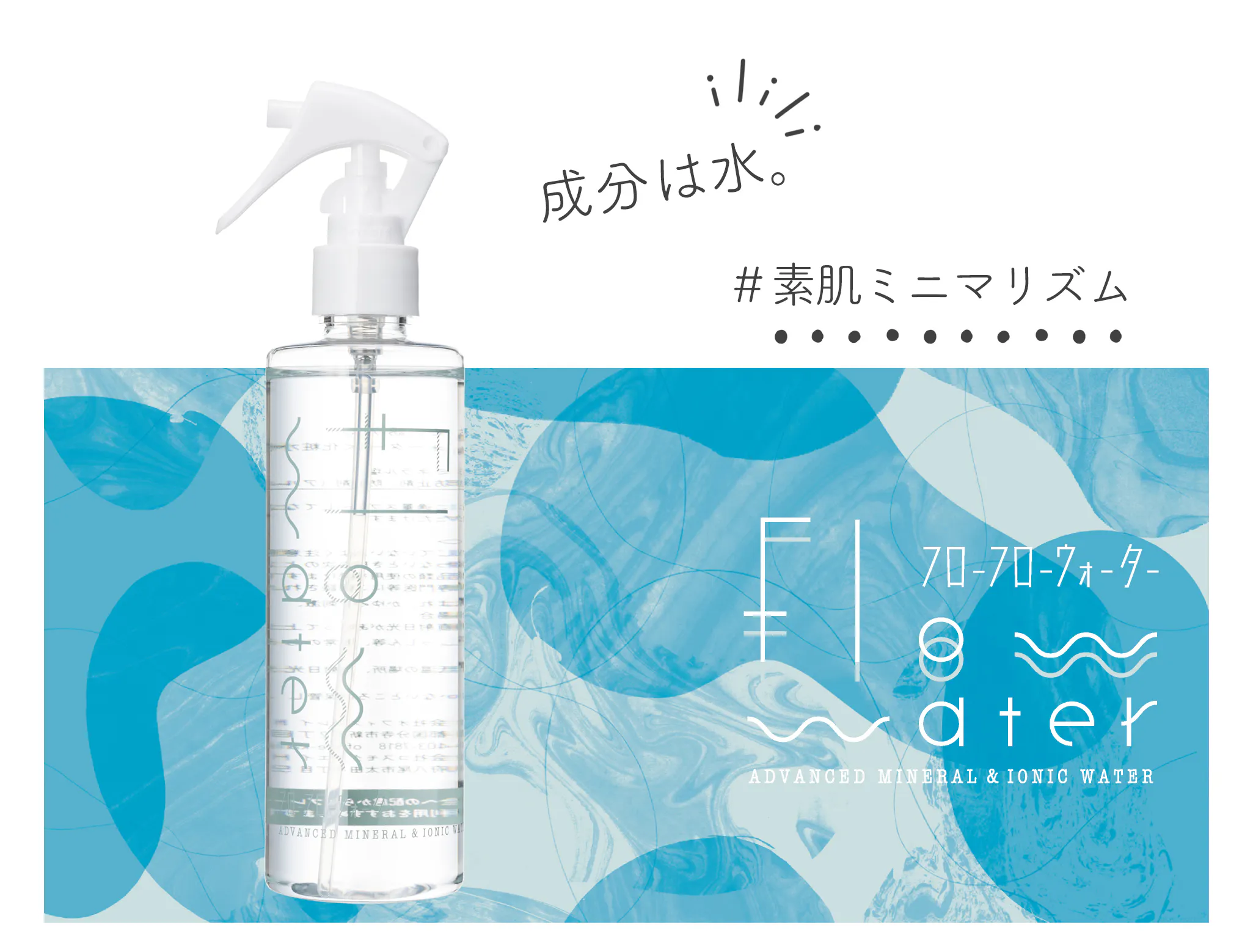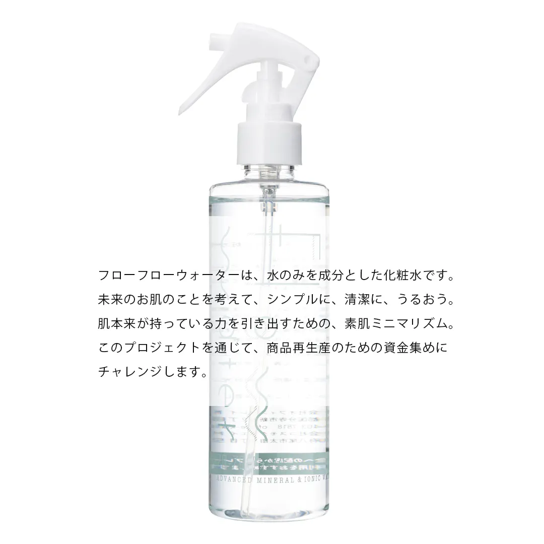 フローフローウォーターは、水のみを成分とした化粧水です。未来のお肌のことを考えて、シンプルに、清潔に、うるおいを。肌本来が持っている力を引き出すための、素肌ミニマリズムです。