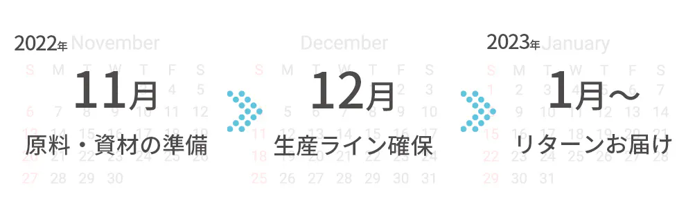 リターンのお届けは2023年1月(※3月)~配送を予定しておりますが、資材準備や輸送状況から遅れる場合がございます。そうした変更が生じた際は、早急に「活動報告」からお知らせさせて頂きます。