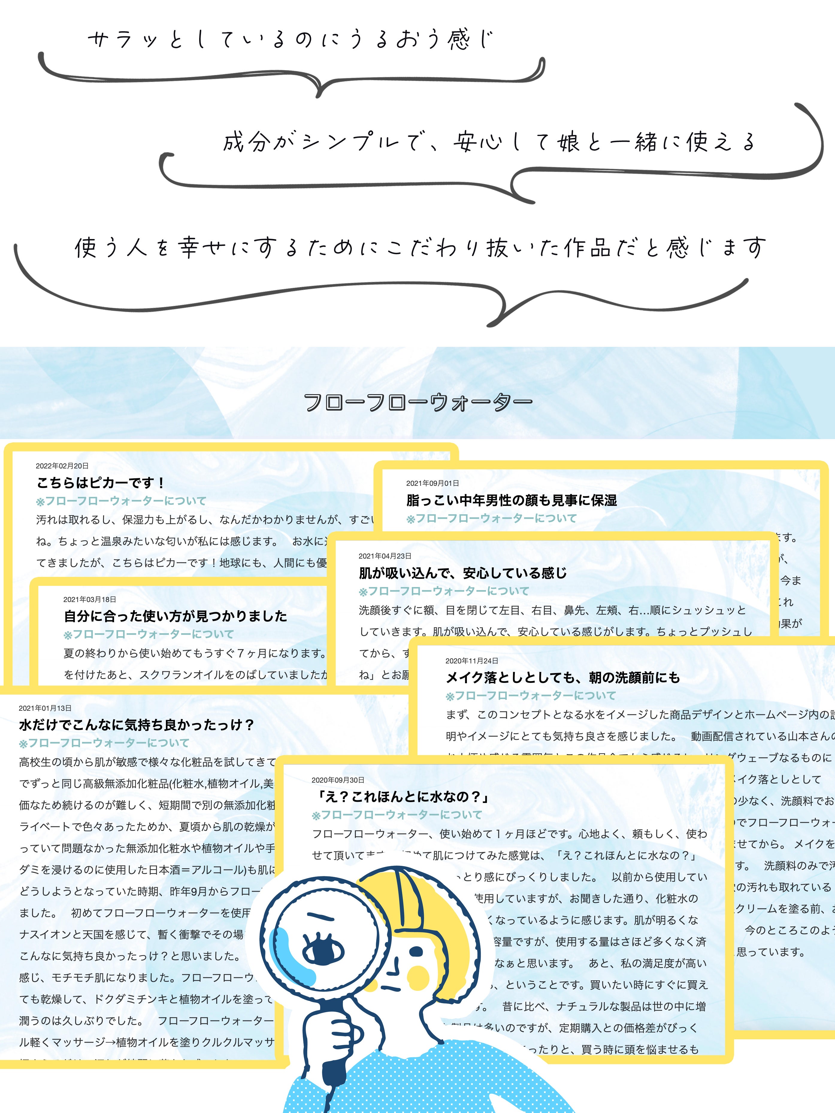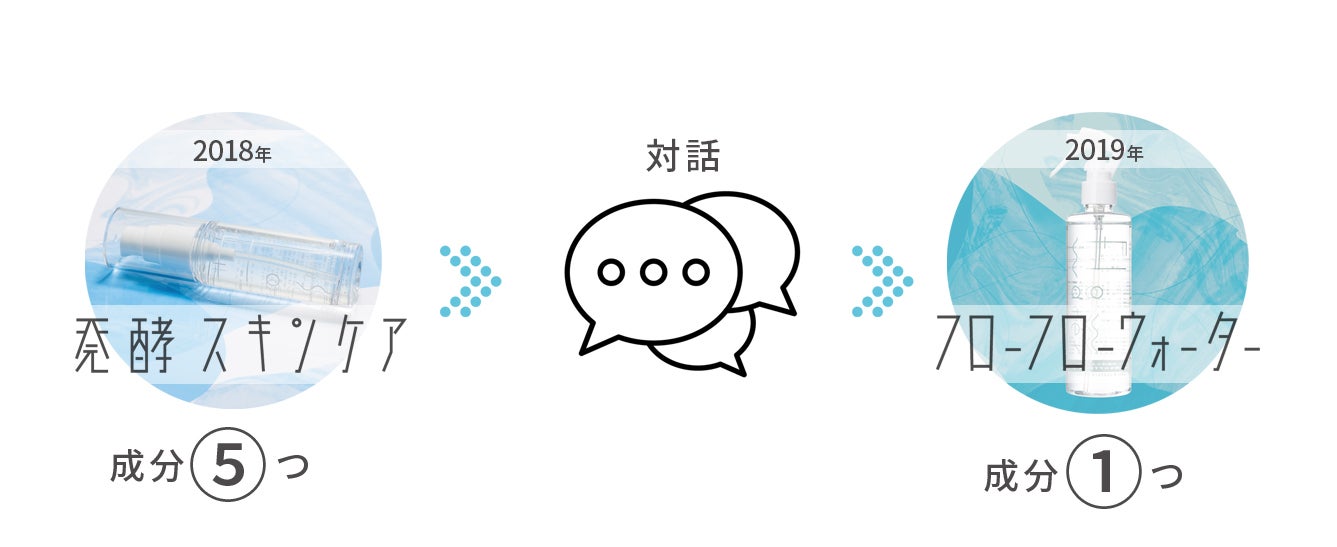 まずは、フローフローウォーターができる前の話です。酵素専門店を経営する中で、お肌のことで悩まれている方の話をたくさん聞きました。皆さま、変えて>試して>足していくスキンケアに疲れていたのです。そこで、余計なものは入れない、成分は厳選して5つのみという「発酵スキンケア」をリリースしました。そして、ユーザーと向き合い、さらなる改良を目指します。