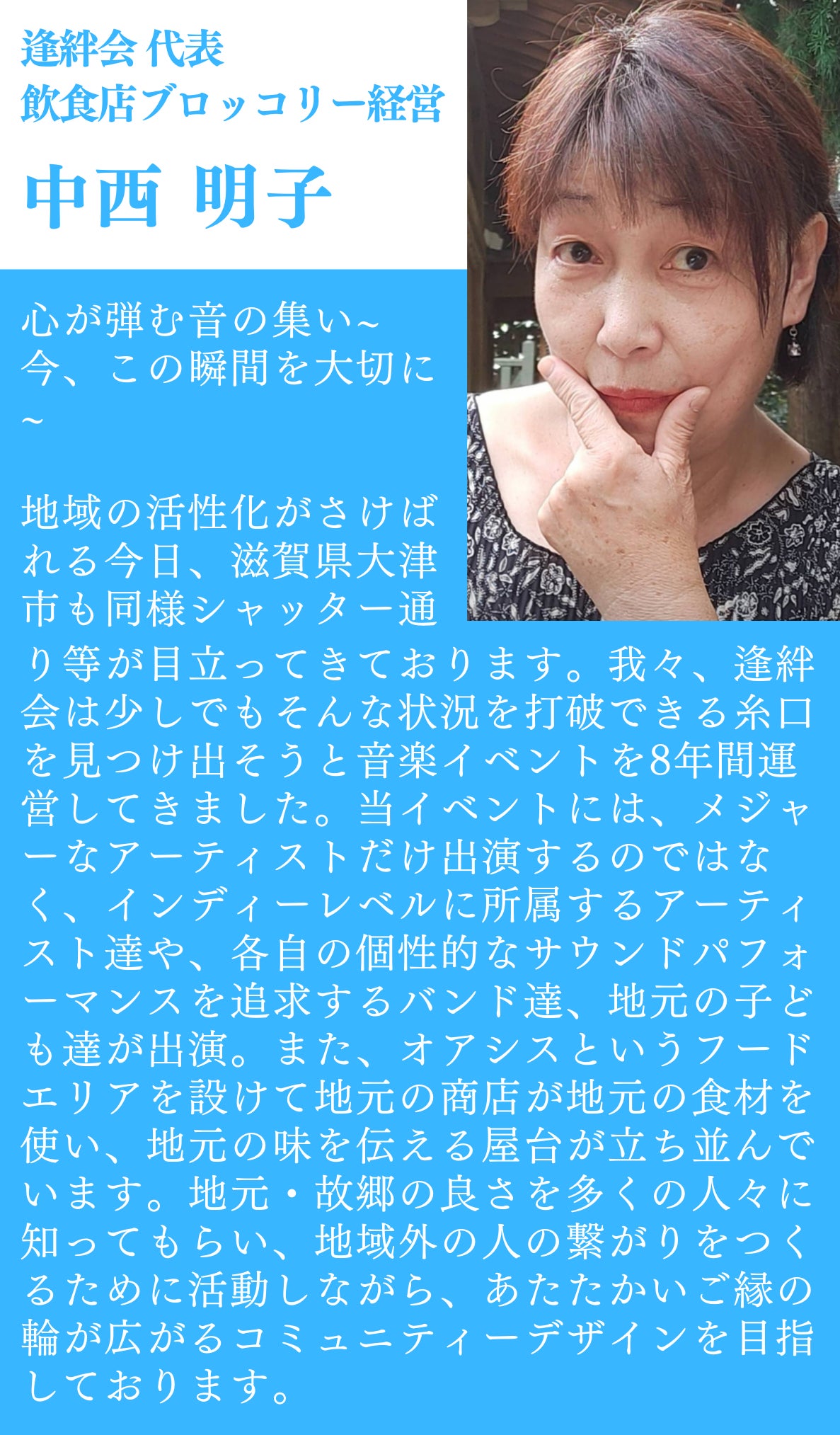 はじめまして!10月29日(土)に、滋賀県のびわこなぎさ公園にて【第3回 心が弾む音の集い!】を開催する、逢絆会の代表の中西明子と申します。数あるプロジェクトの中からご覧いただきありがとうございます!