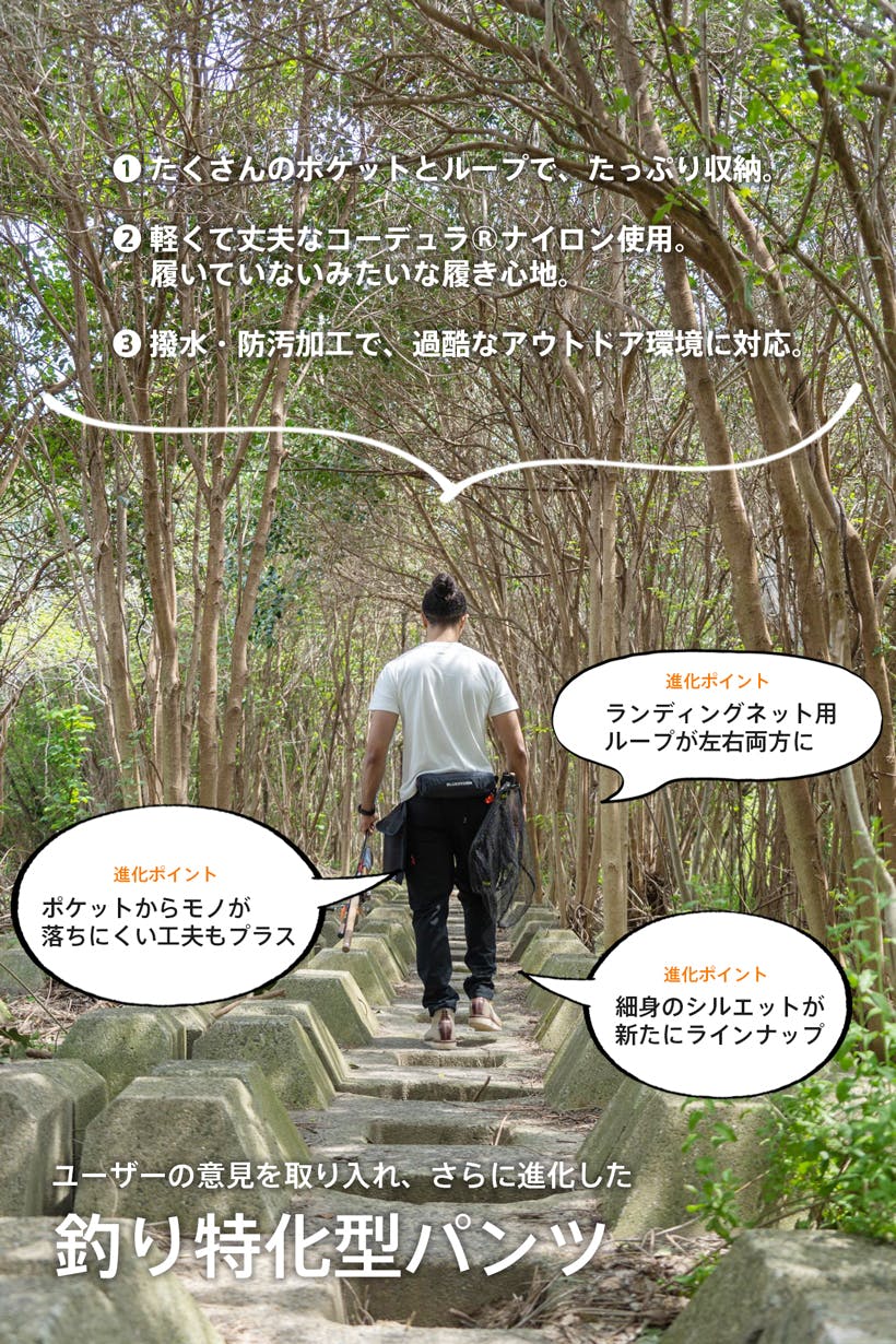 オリジナルモデルの「釣り特化型パンツ」のリリース後、「もうちょっと細身のタイプが欲しい」というご意見をたくさんいただき、その声にお応えして誕生した新たなシルエットの「釣り特化型パンツ」。
