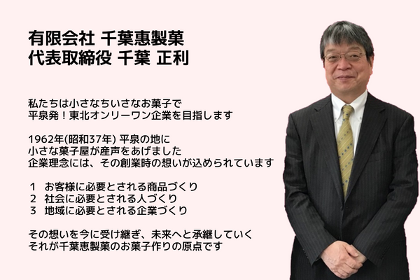 1人目は、当然ながら製造する菓子メーカーの千葉社長。独特の味わいのあるキャラクターで場を和ませてくれる一方、挑戦する姿勢や、社員と平泉を想う強い気持ちを併せ持つ、本当に学ぶべき人です。