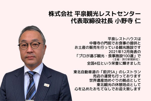 2人目は、ダンディーな小野寺社長。地図で見ると中尊寺の真向かいに位置する巨大な平泉レストハウスの経営者です。東北道の平泉に最寄りのSAの運営も手がけており、まさに平泉観光の中核事業者。そんな大物がなぜか僕たちの創業時から目を掛けてくれて、何かと支援やチャンスを与えてくれます。頭の上がらない人です。