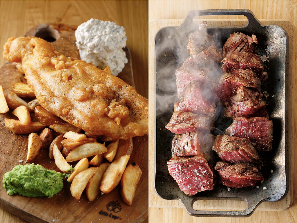 Brewery KAENの名物メニュー。フィッシュ&チップスと国産牛フィレ肉の鉄板焼き。