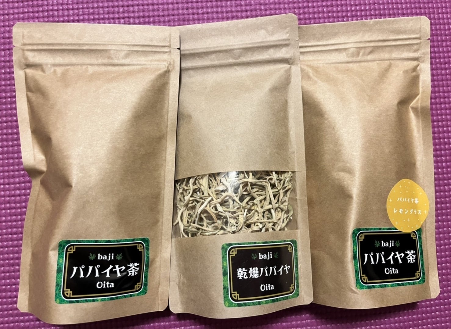 青パパイヤは実だけではなく、葉っぱも乾燥させるとお茶として飲用する事ができます。そして何より青パパイヤは今注目の「酵素」の含有量が農産物の中で最も多く「酵素の王様」と呼ばれるているくらいなんです!その青パパイヤを当農園で収穫後、実や葉っぱを乾燥させ、そのままのパパイヤ茶はもちろんハーブとブレンドしたお茶などを作っております。また他にもさまざまな種類のじゃがいもなどの自慢の収穫物を色々と年間を通じて販売中です。本当に有難いことにお買い上げの皆様には大変ご好評を得ております!!