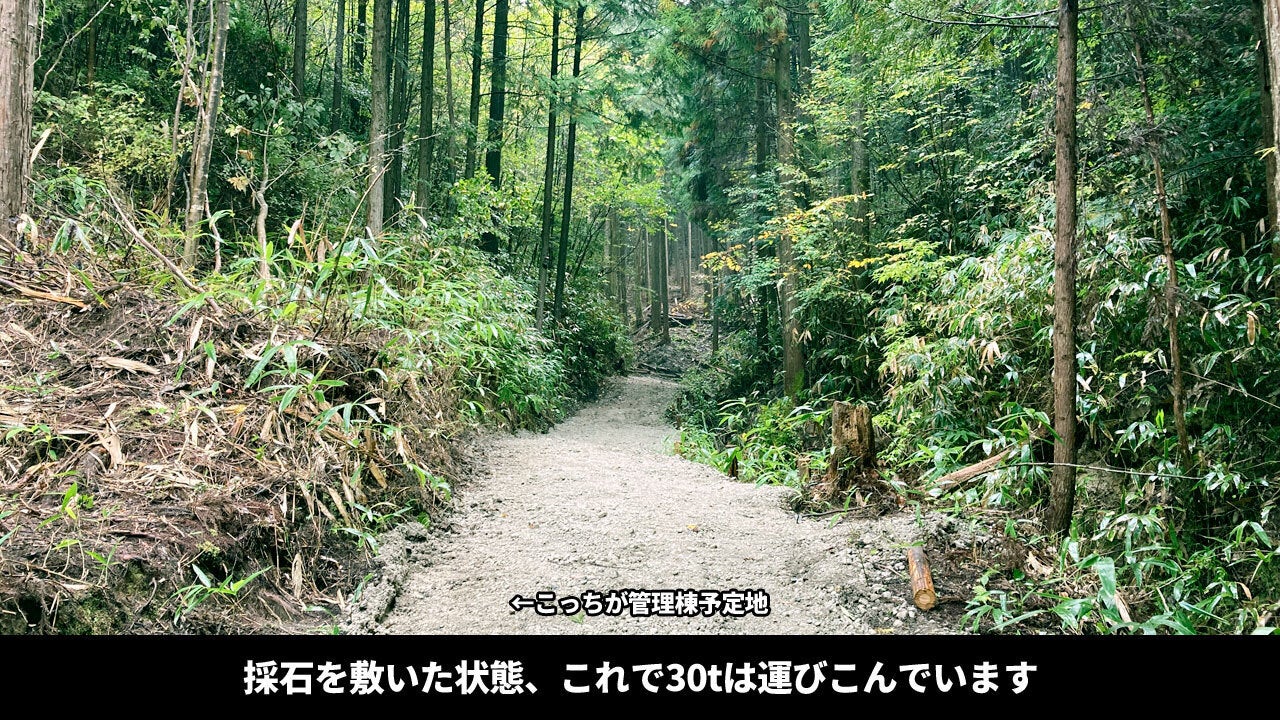 画像の状態は、荒れ放題の林道に勾配をつけるため、そして地盤をしっかりさせるために採石を敷いて行っています。