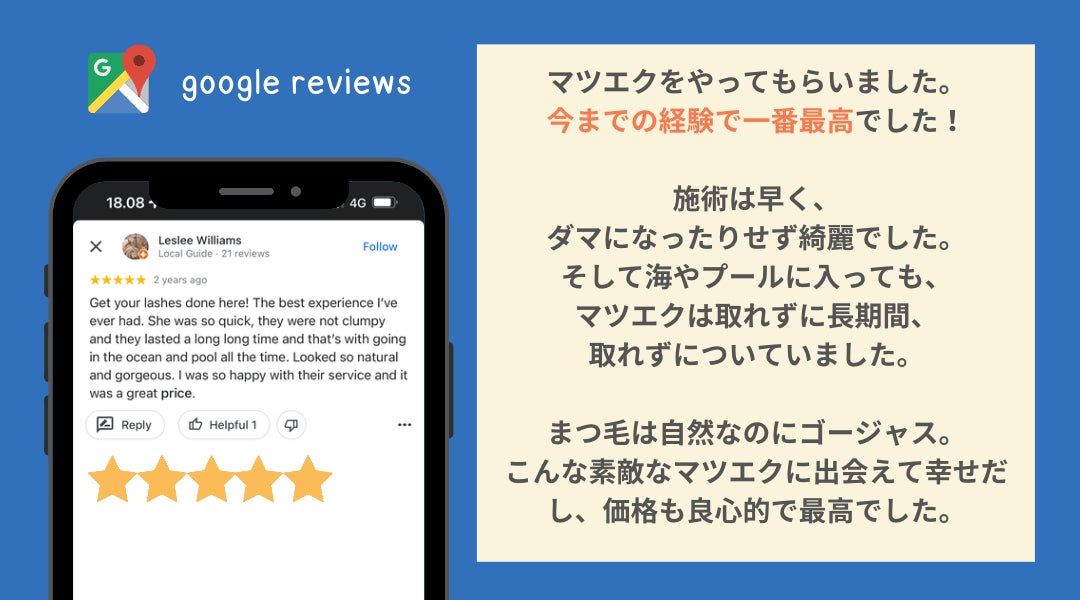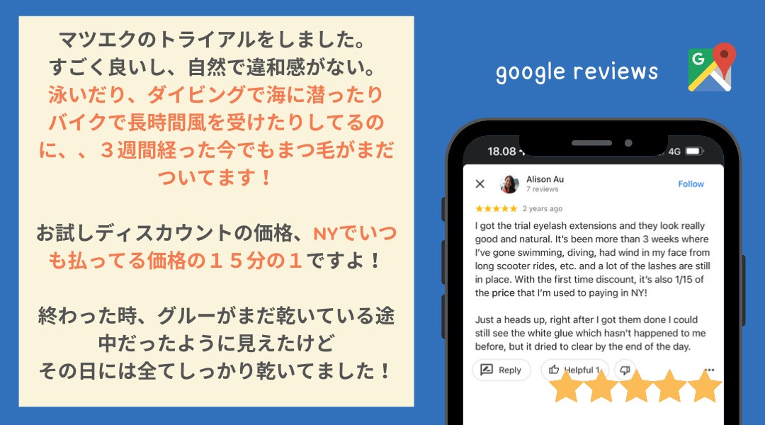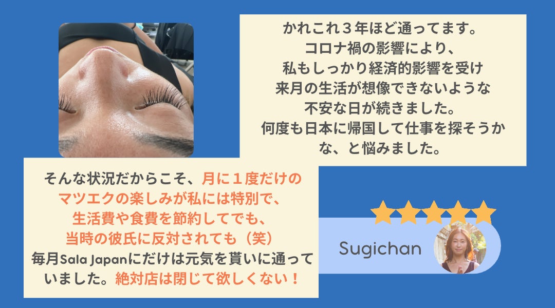 コロナ禍で気持ちがふさぎこんでいたとき、Sala Japanでまつ毛エクステをお願いすることに。いい香りで満たされた店内やスタッフとの他愛ない雑談、そしてぱっちり上がったふさふさのまつ毛。自然と気持ちまで前向きになれました。日本にいた頃と同じハイクオリティなのに、この価格設定はありがたいです。