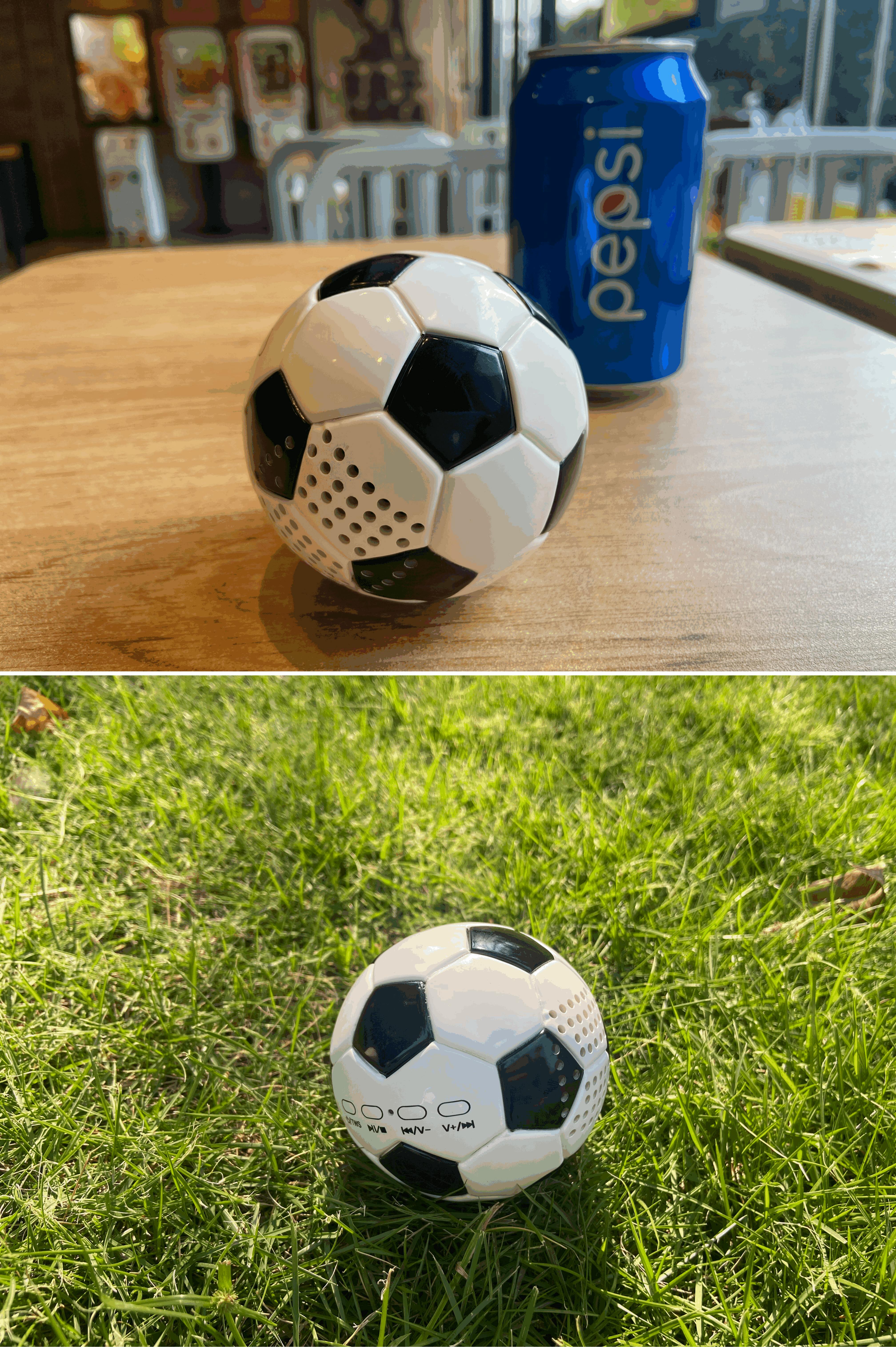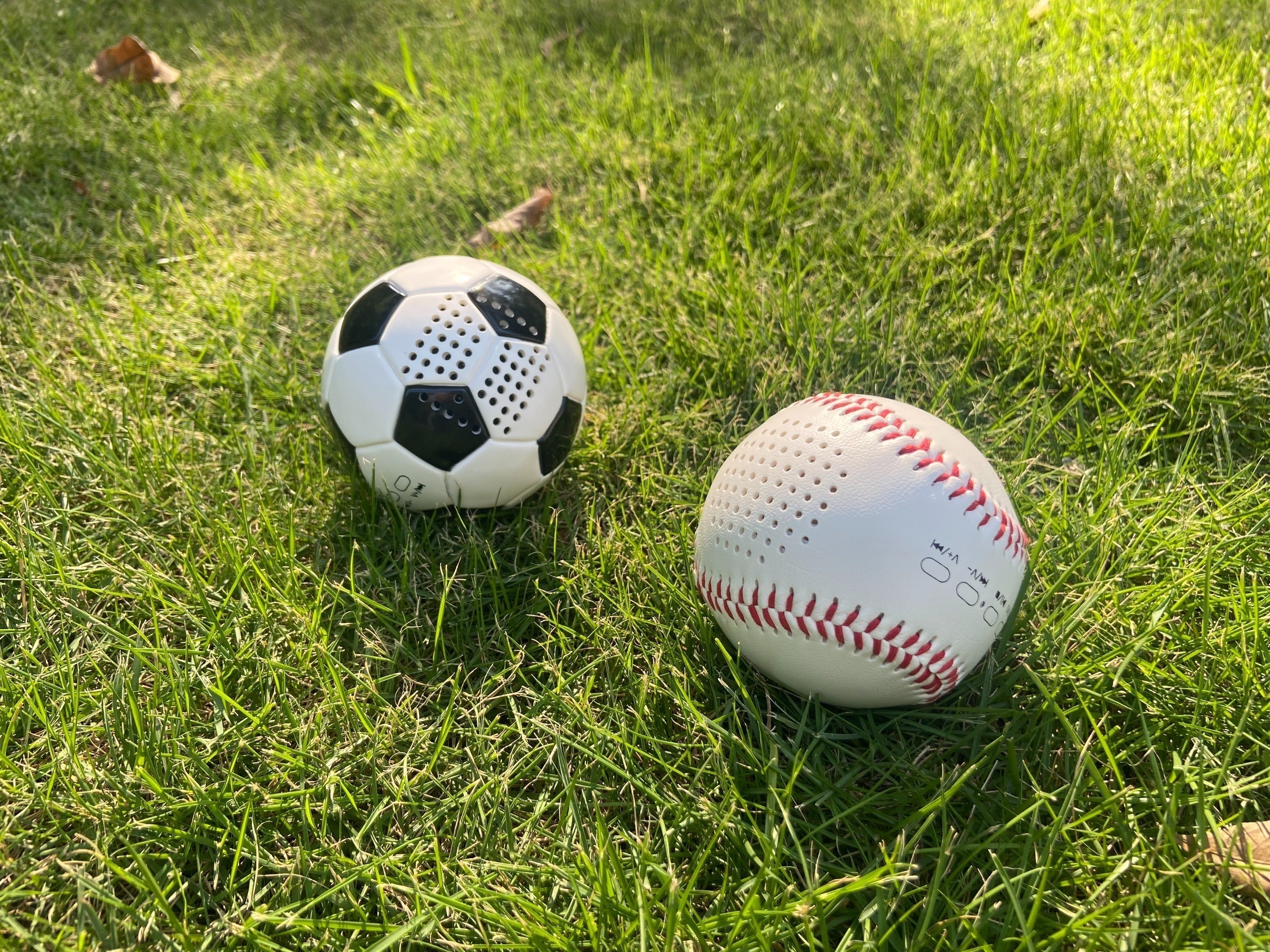 表面は普通のサッカーと同じ材質を使用、重量は142g(卵三個分相当)。搭載機能は上の野球スピーカーと同じです。