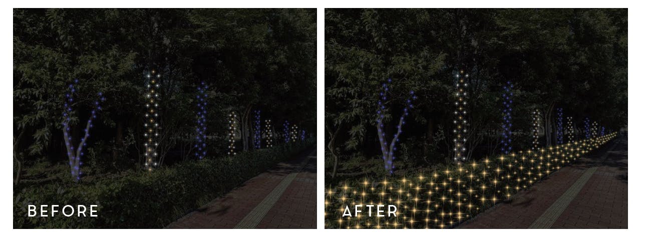 【ふなばしアンデルセン公園】や【昭和記念公園】のように街を彩る冬の風物詩となるイルミネーションを思い描いています。