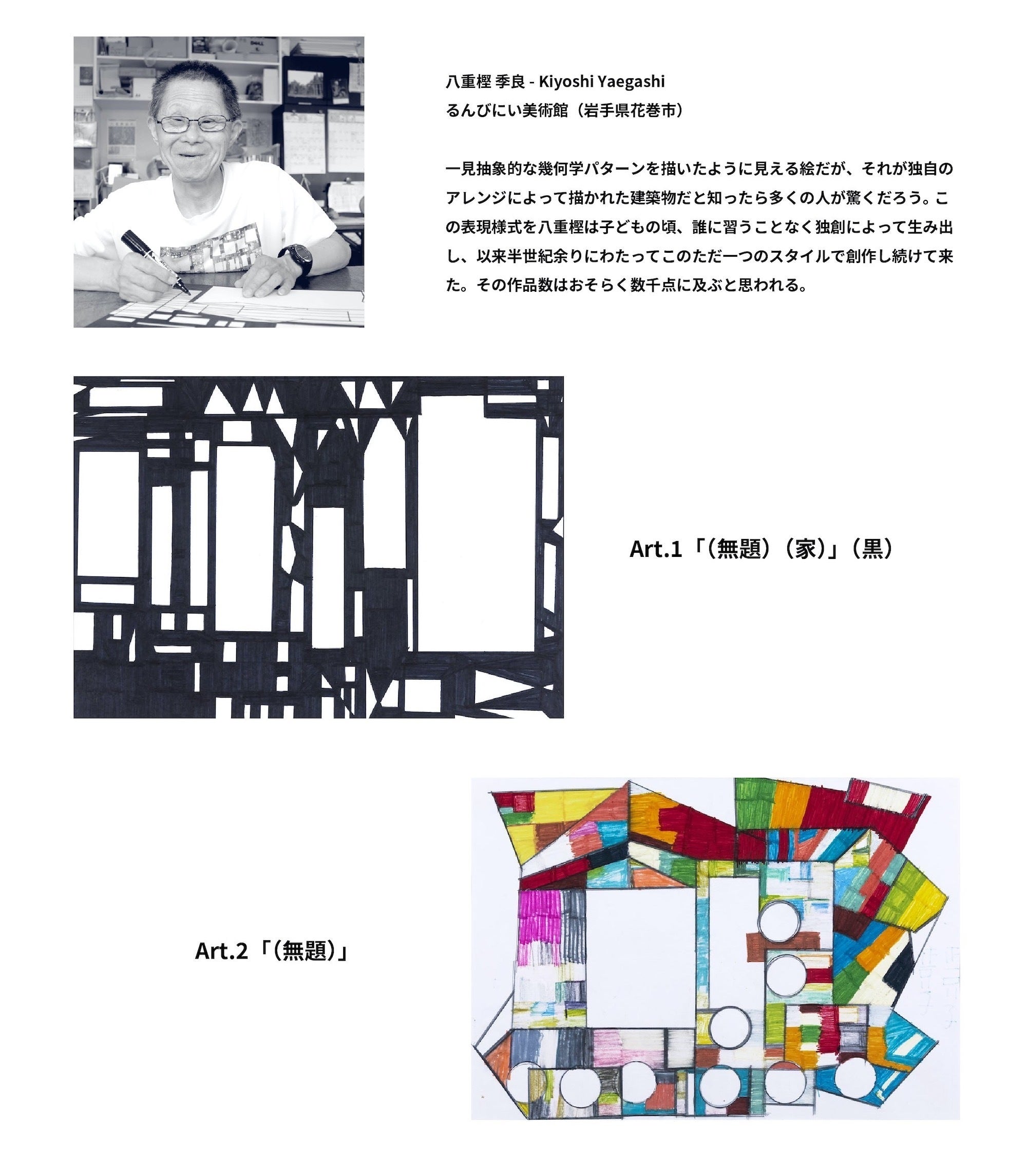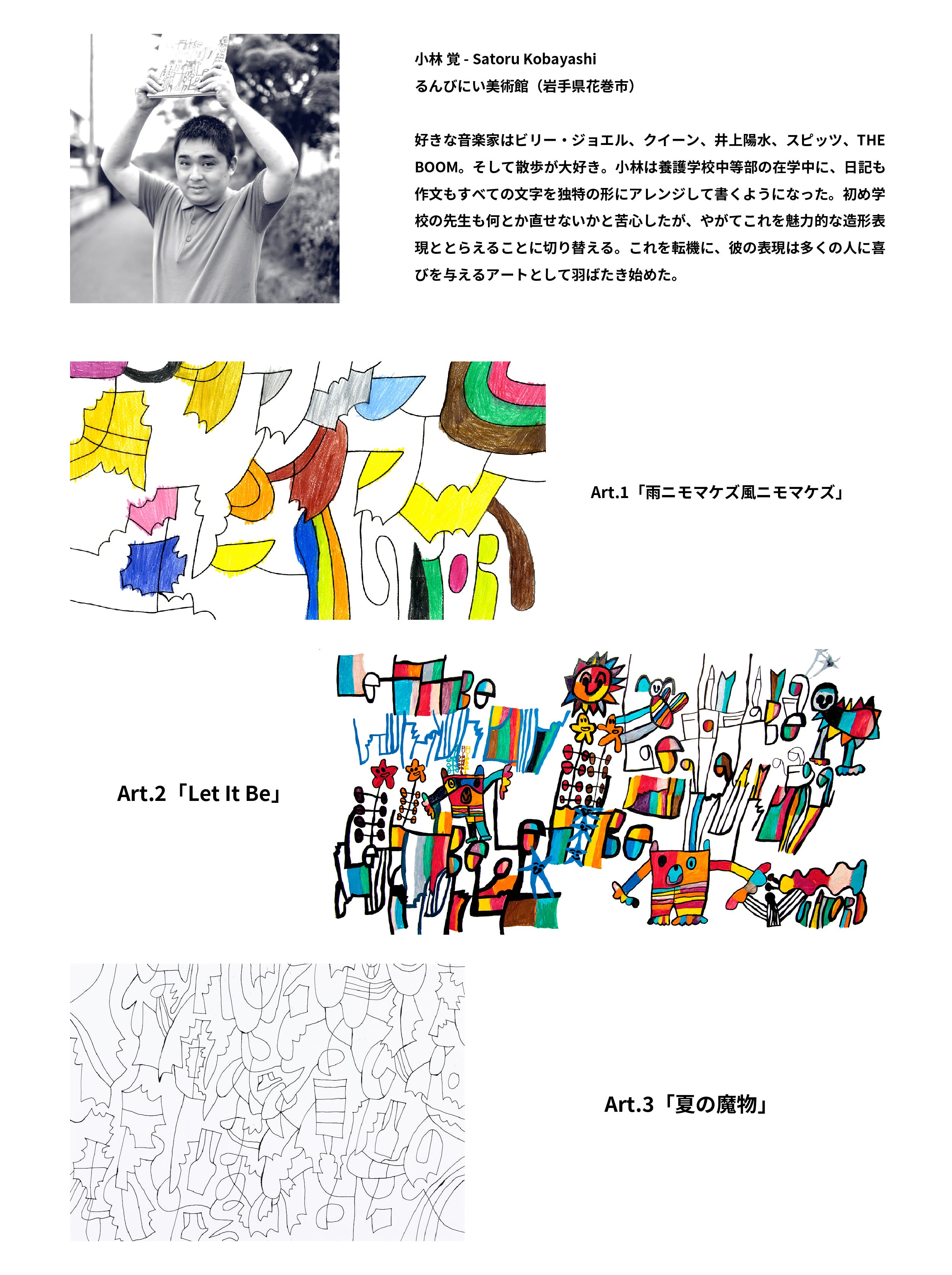 今回は、私たち双子が異彩と出会ったはじまりの場所である、岩手県花巻市の「るんびにい美術館」のアトリエに在籍する岩手県出身の作家、小林覚と八重樫季良のアートを起用しています。