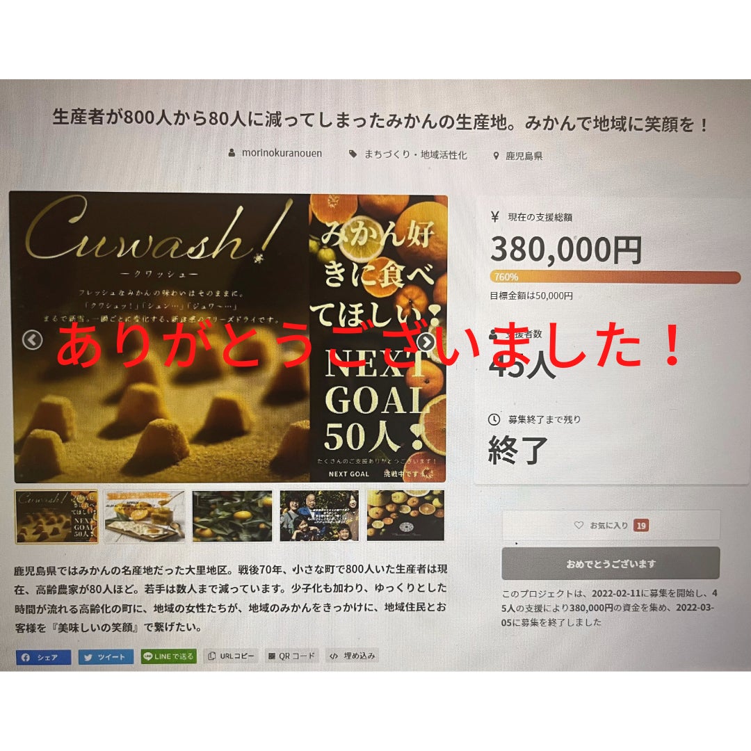 2023/02/22 09:00おはようございます。先行予約受付は残り2日となりました。ここまでたくさんのご支援をありがとうございます(^^)cuwash!個包装タイプは、特別感があるところにそっと記憶に残る演出をしてくれるおもてなしの一品になると思っています。キャンプファイヤーで3週間、記載しておりますが、大切な方をおもてなしする場面、この一瞬を記憶に残したい。そんな思いのある相手、時間にお茶と一緒にお出しするお茶菓子として選んでくださる方が多い傾向があります。cuwash!1品だけではなく、プラス、郷土を感じる伝統のお菓子と組み合わせて。ワンランク上のチョコレートは1粒で十分。A5ランクのお肉は少量だから美味しい。cuwash!は2gだから相手に強いインパクトを残して、大切な時間を相手の記憶に残す。その、演出をしてくれる商品。cuwash!はお客様にそういう商品として見ていただいているようにも感じます。本当にありがたいことです。本当にありがとうございます。発送の準備もしておりますので、もうしばらくお待ちください。今日も1日元気に頑張りましょう!(^ ^) もっと見る