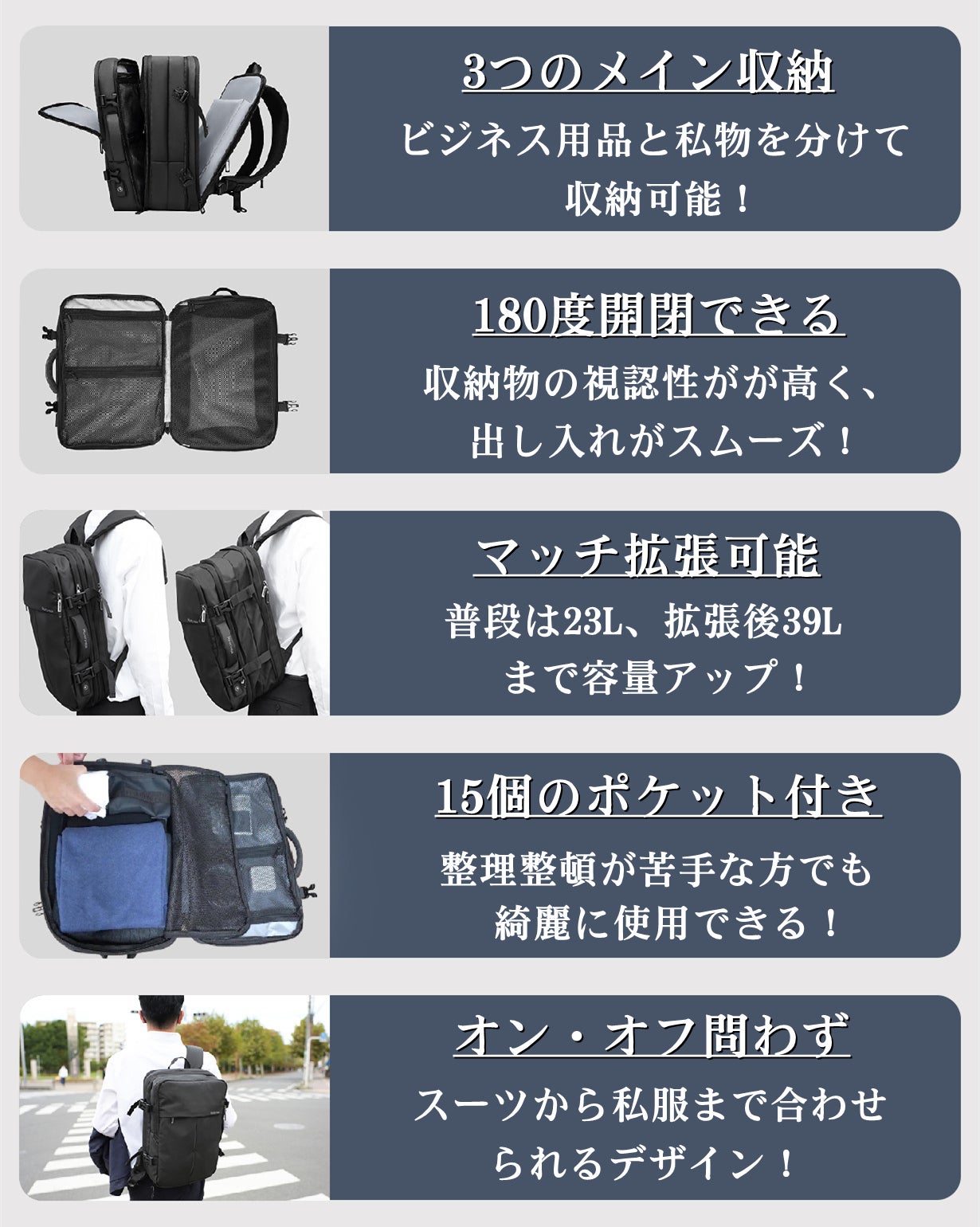 ビジネスから旅行までマルチに活躍する、容量39Lのビジネスリュック。
