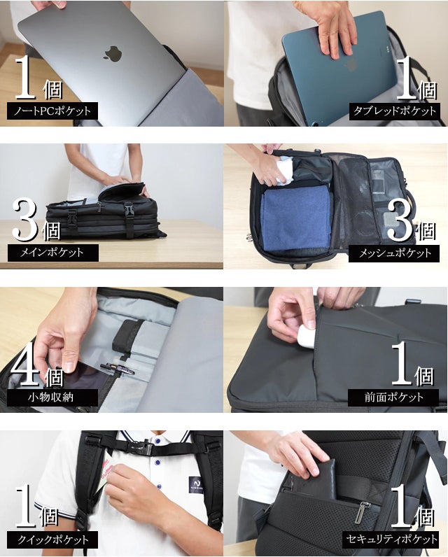 ビジネスシーンでは書類や電子アクセサリー類など、小物類や綺麗に保って持ち運びたい荷物も多くあるため、ポケットの数も非常に重要になってきます。