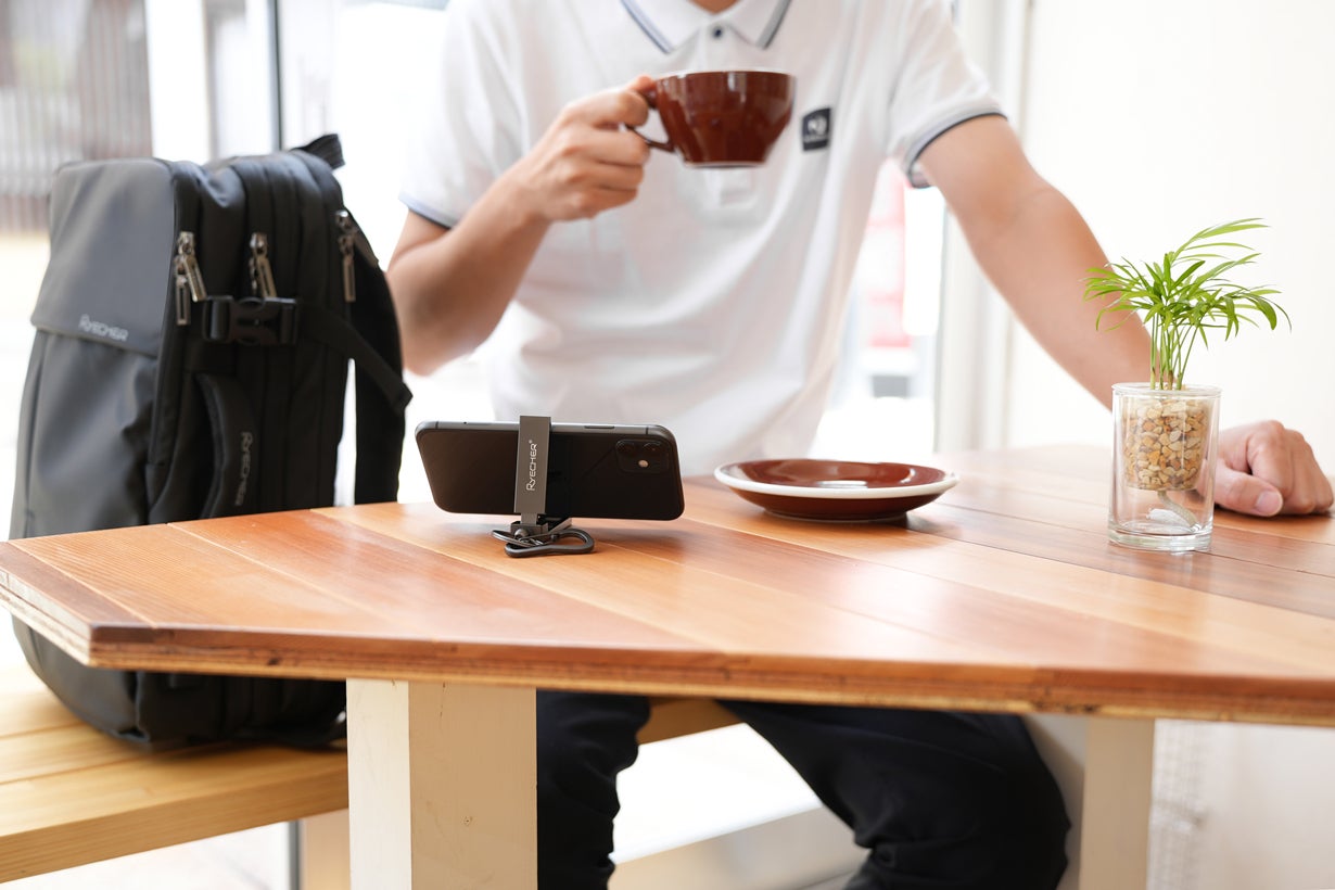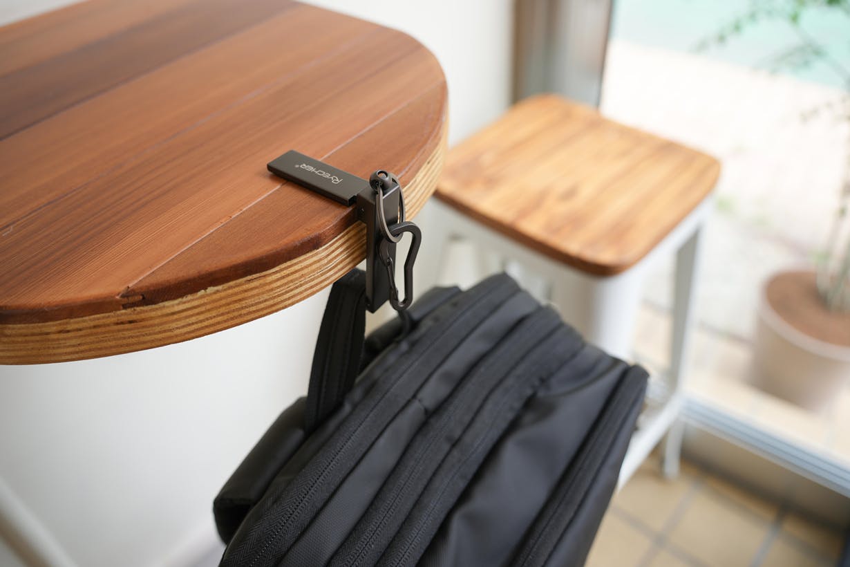 バッグハンガーのほか、スマホ・タブレットスタンド、カラビナを使っての吊り下げ収納としても使えます。