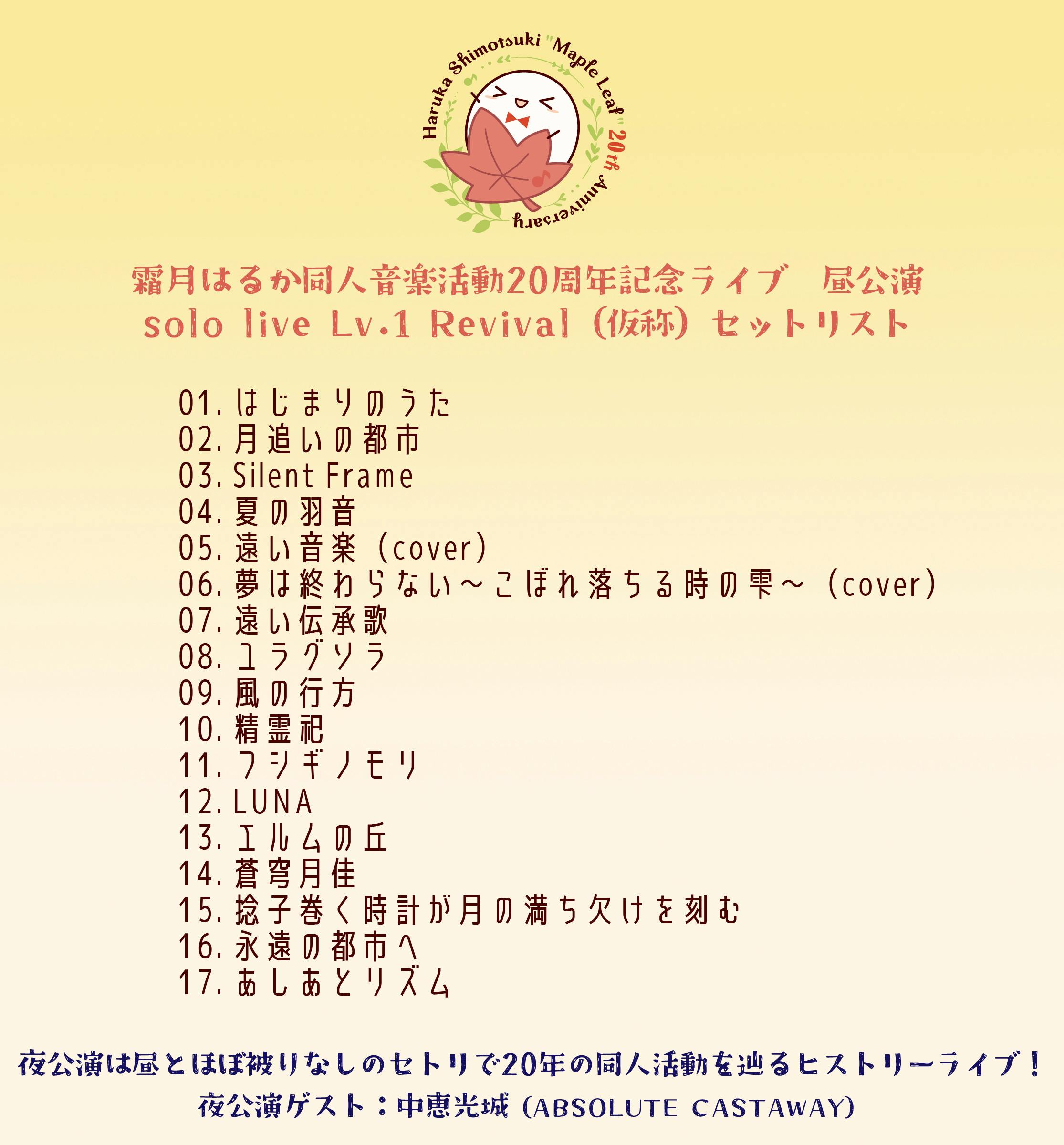 ライブ昼公演はsolo live Lv.1のリバイバル公演、という事で、昼公演のセットリストを公開いたします。当時(2006年)参加されていた方も、終わってから知ったという方も、レアなライブ間違いなしなので是非ご参加ください♪