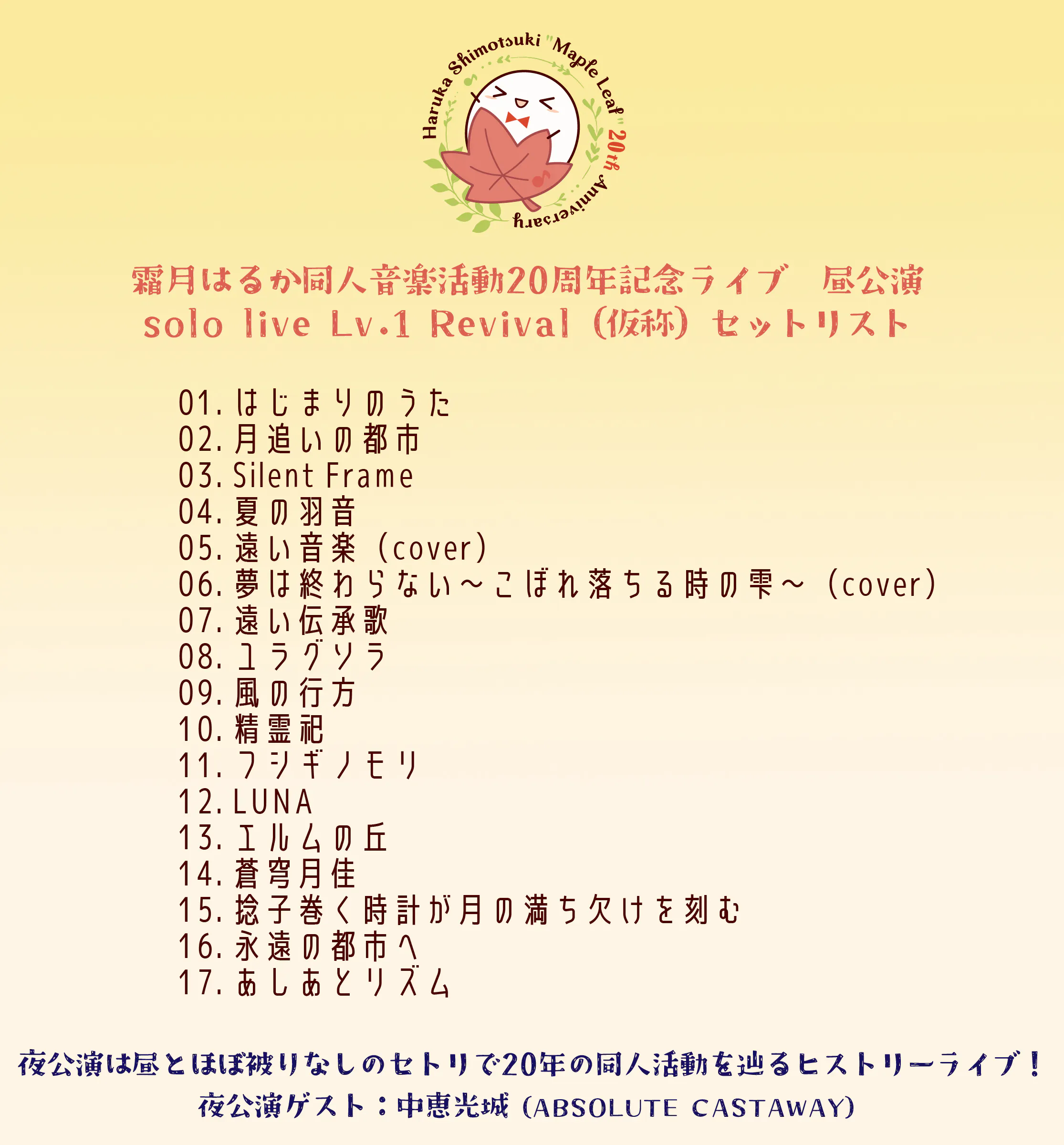 以下の初期同人自作曲リストの中から1曲選んでいただき、その楽曲をリアレンジして歌を再収録、本プロジェクトで制作する、霜月はるか同人音楽活動20周年記念アルバム『Maple Leaf BOX II』に収録します。