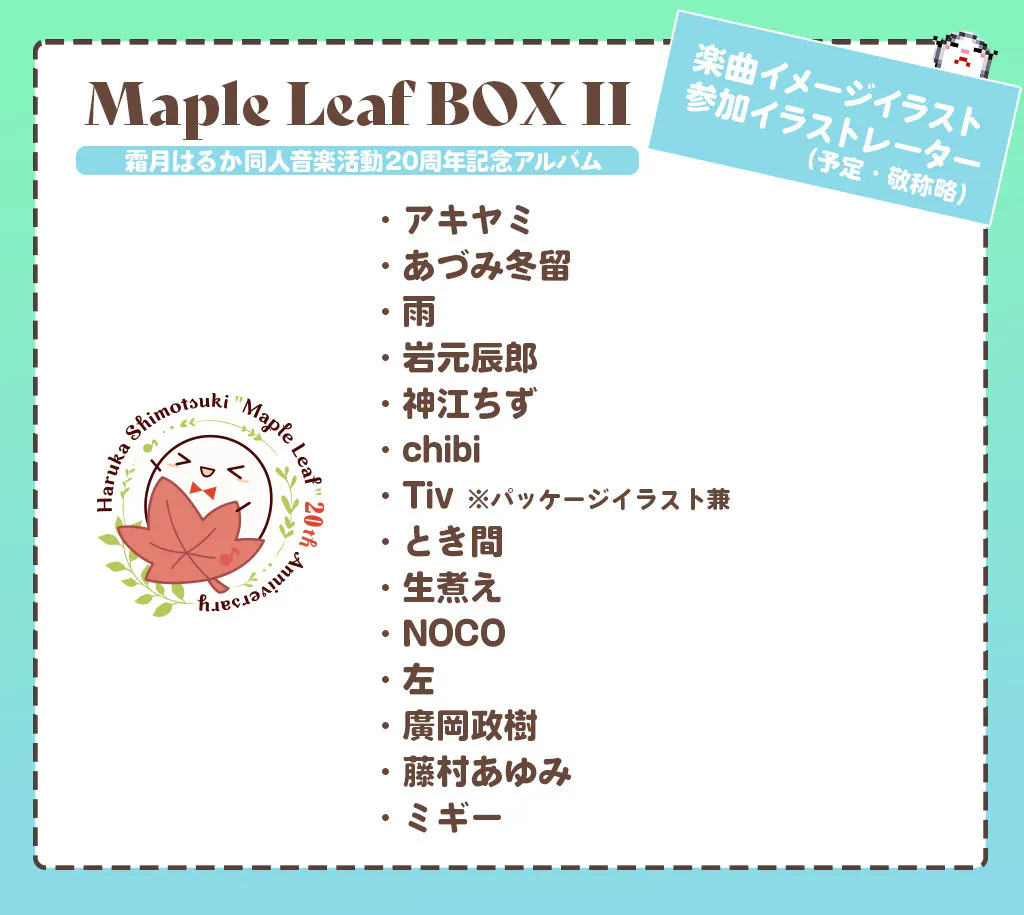 同人音楽活動20周年記念アルバム『Maple Leaf BOX II』で収録曲1曲につき1枚、14曲すべての曲にイラストレーターさん描き下ろしの楽曲イメージイラストが付きます!(1枚はイラスト公募)イラストはブックレットに掲載いたします。