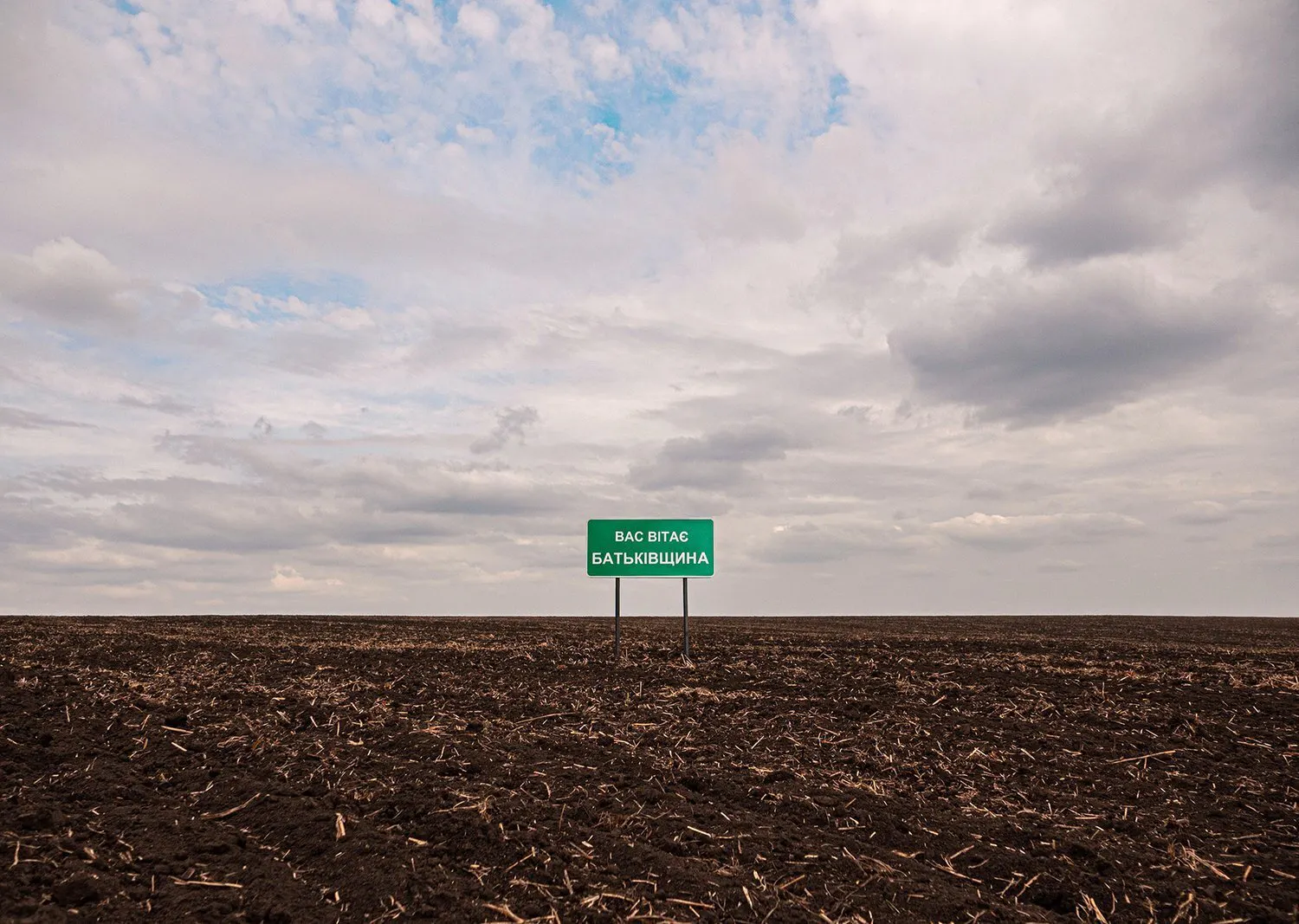 [ウクライナの大地で制作したインタレーション「祖国へようこそ」と書かれた標識作品(戦争前)]