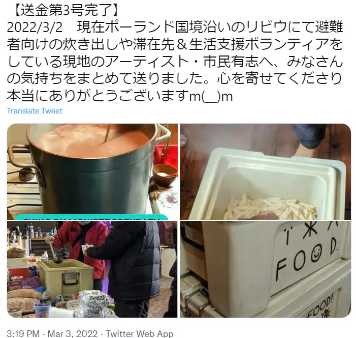 ③2022/3/2【送金第3号完了】リビウの避難者の炊出し、生活必需品購入等の現地アーティストたちによる人道支援