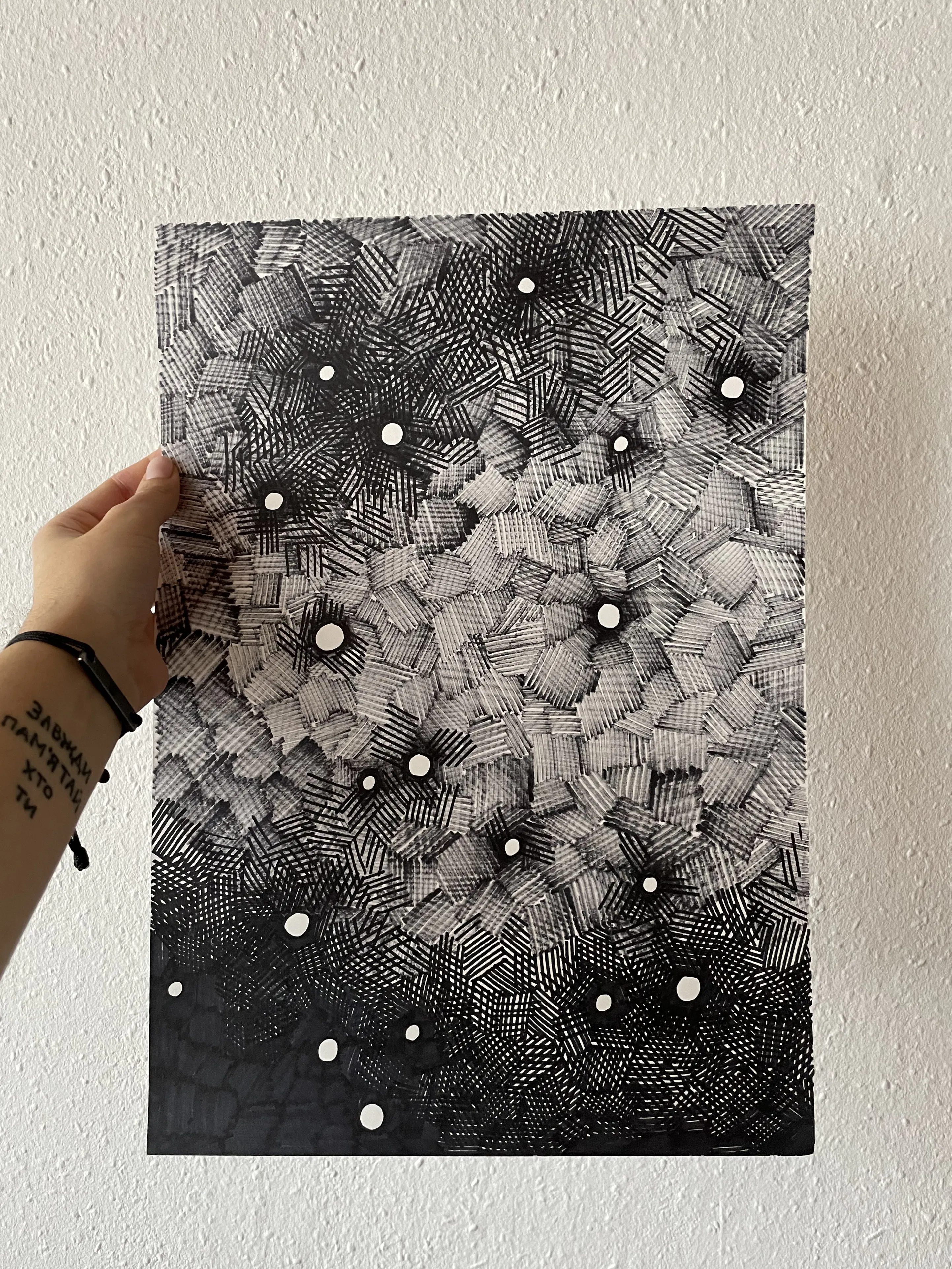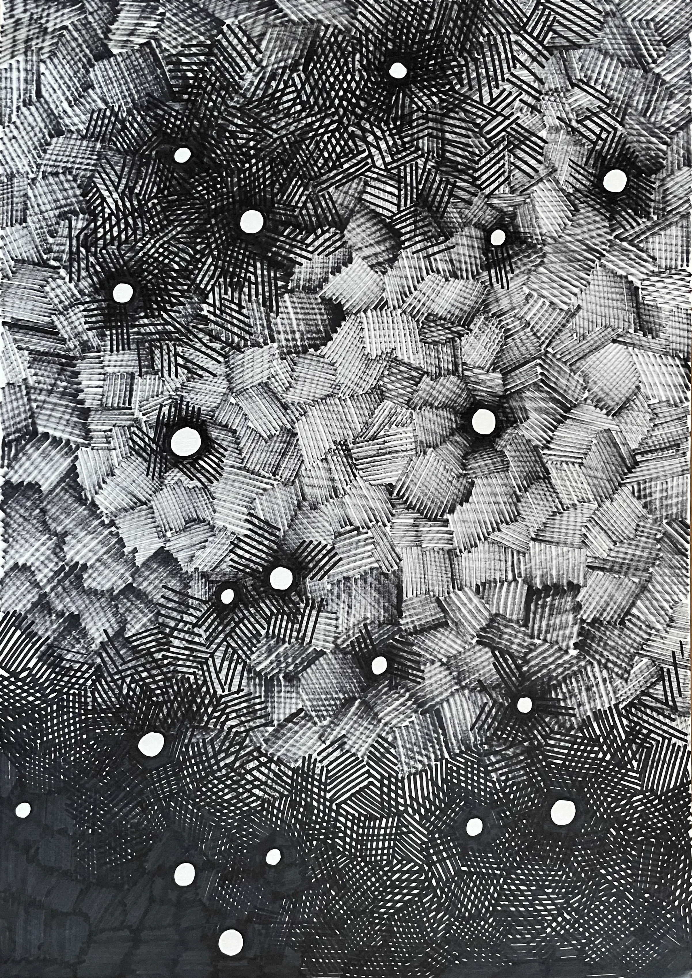 戦争後、インフラが破壊され灯りのともることのないハルキウの街で見上げた夜空の星々から着想したドローイング作品。