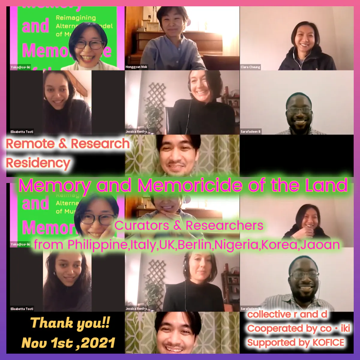 韓国のキュレーターHonggyun Mokと共同開催。イタリア、フィリピン、ナイジェリア、ドイツ、イギリス、香港、アルゼンチン、韓国等から「地域性」とともに不確定な時代における「土地と記憶」、ポスト(ネオ/デジタル)コロニアリズムについて思考する契機となりました。