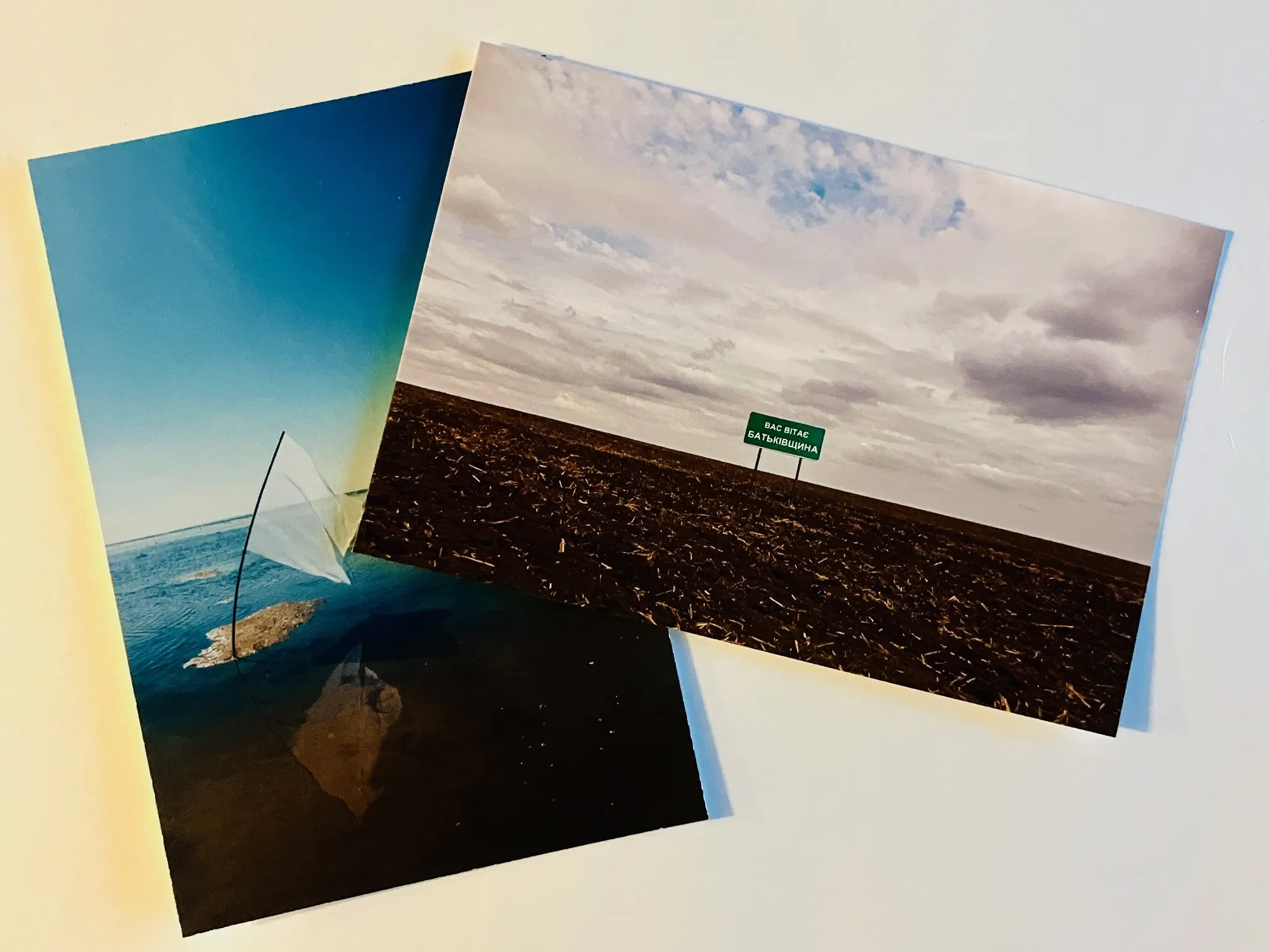 ポストカードはご希望の方にあわせ、今回は2種類用意することに致しました。ウクライナ、ハルキウ近郊の大地に掲げた「祖国へようこそ」の標識と、マリウポリに掲げた透明な旗のランド・インスタレーション作品(Olia制作・戦争前)です。