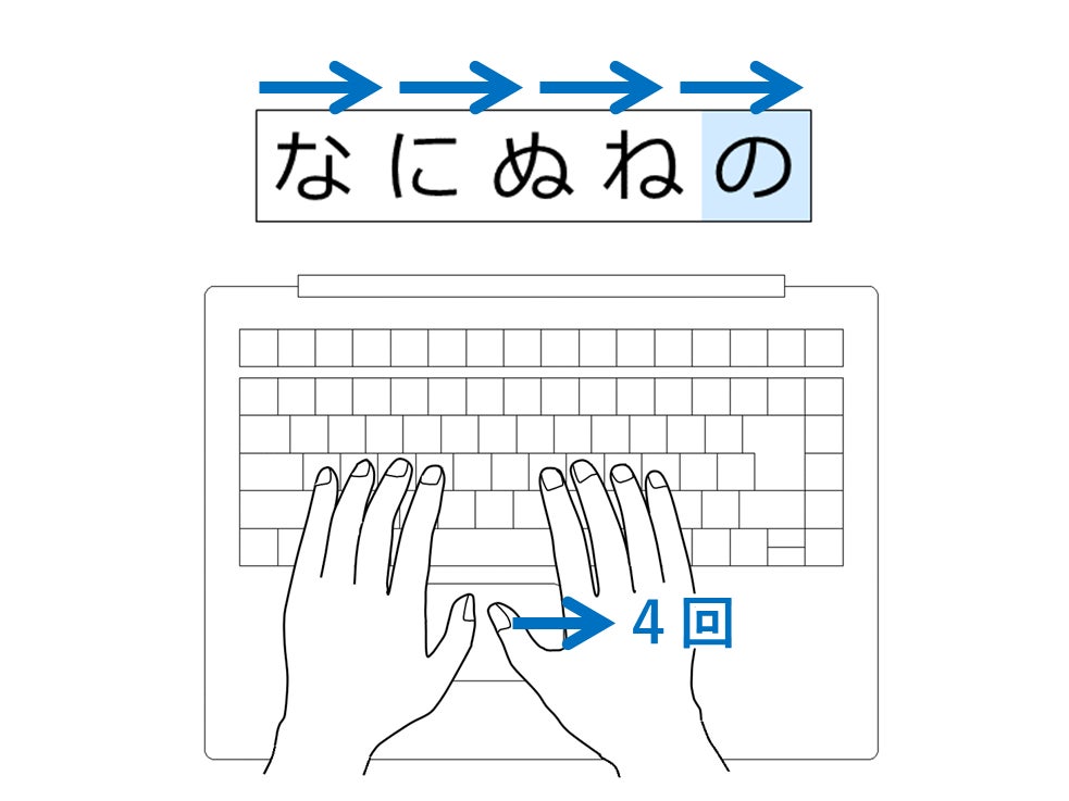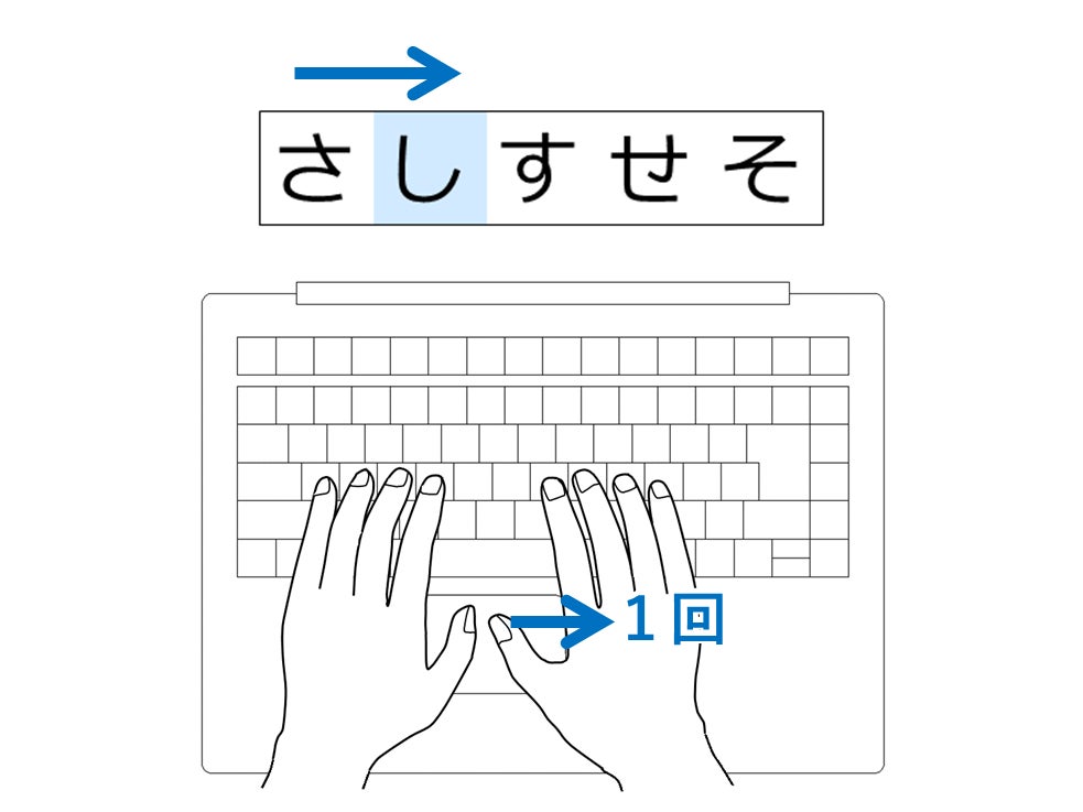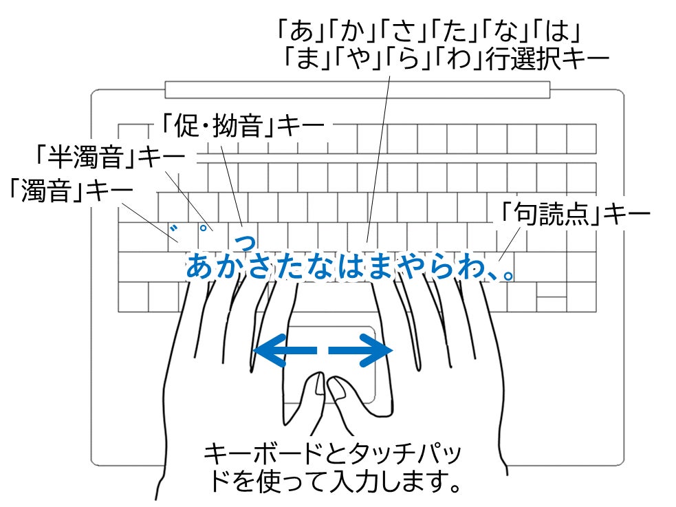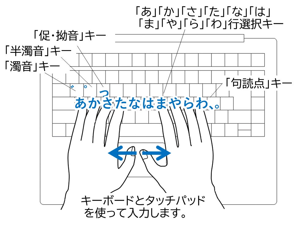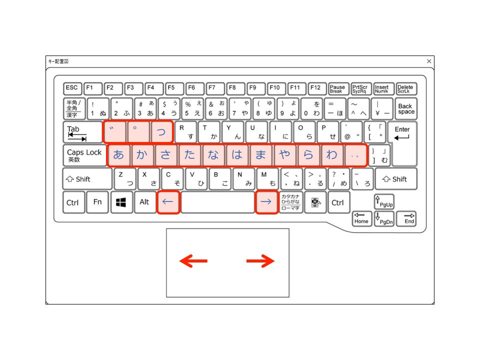 (タッチパッドの無いキーボードを使用する場合、タッチパッドでのスワイプ機能は使えませんが、「左コマ送り」キーと「右コマ送り」キーを使用することで、文字入力は可能です。)