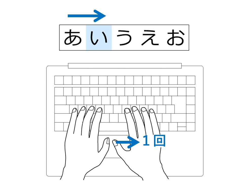 指が乾燥している時など、タッチパッドの動作が不安定なときは、「左コマ送り」キーと「右コマ送り」キーを使用することもできます。「左コマ送り」キーを押すとタッチパッドの左スワイプと同じ動作を、「右コマ送り」キーを押すとタッチパッドの右スワイプと同じ動作を行います。押した回数分、青い領域が移動します。
