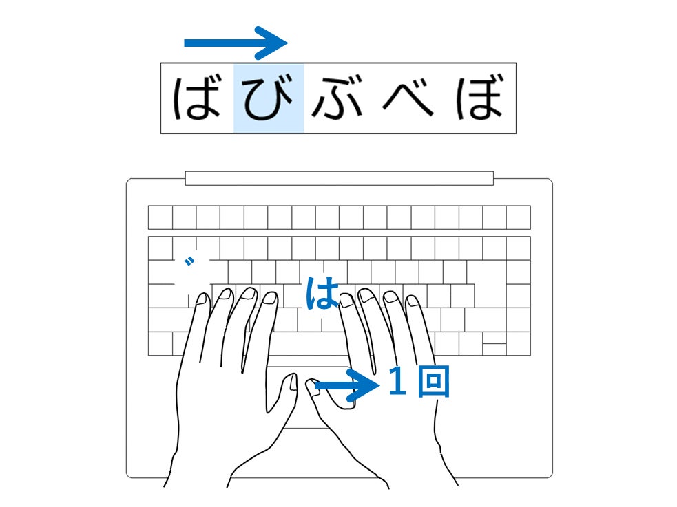 「び」など、濁音を入力したいときは、濁音キーを使います。「はひふへほ」のガイドを表示し、濁音キーを押して「ばびぶべぼ」に変えてから、スワイプをして「び」を選びます。