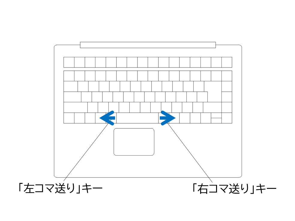 ※USキーボードの場合は、「I」キーが「左コマ送り」キーに、「O」キーが「右コマ送り」キーになります。