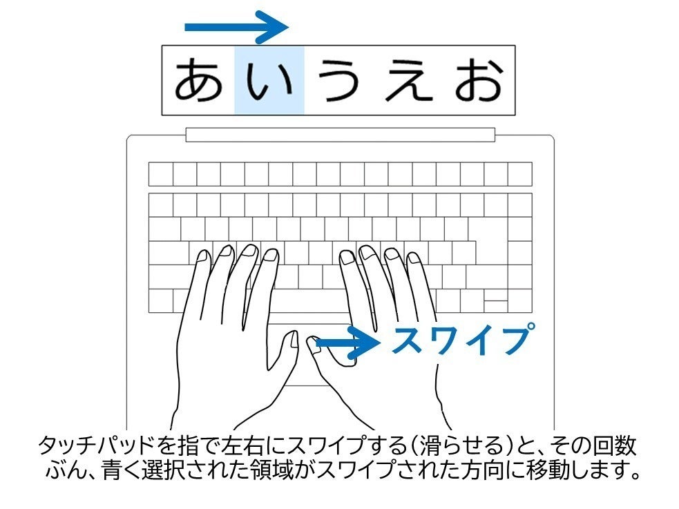 タッチパッドを指で左右にスワイプする(滑らせる)と、その回数ぶん、青く選択された領域が左右に移動します。