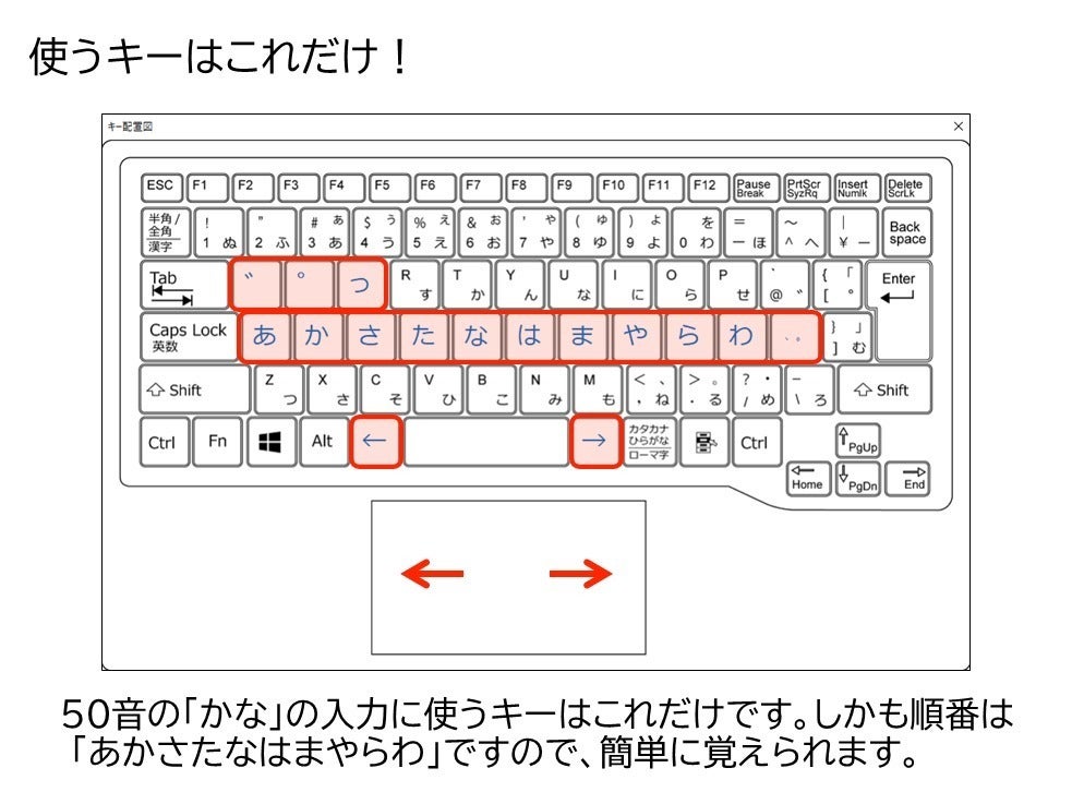 50音表は日本語話者の頭にもともと入っています。キーの順番は50音表の通り(あかさたなはまやらわ)なので、新しく配列を覚える必要がありません。ローマ字を覚えていない幼児や低学年児童でも簡単にパソコンで文字入力をすることができます。