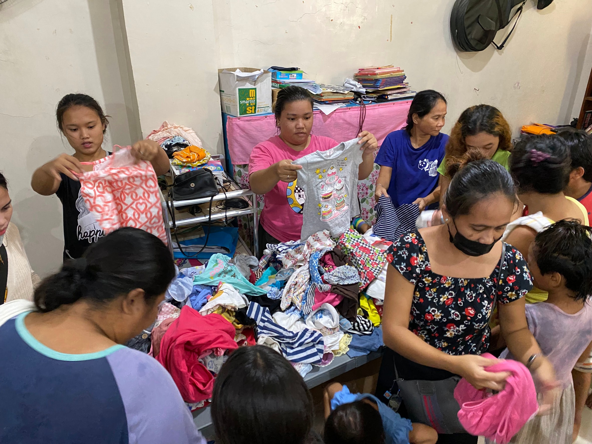 ※衣類配布の様子(女性スタッフの方が、子どもの性別やサイズに合わせて配ってくださっています。)