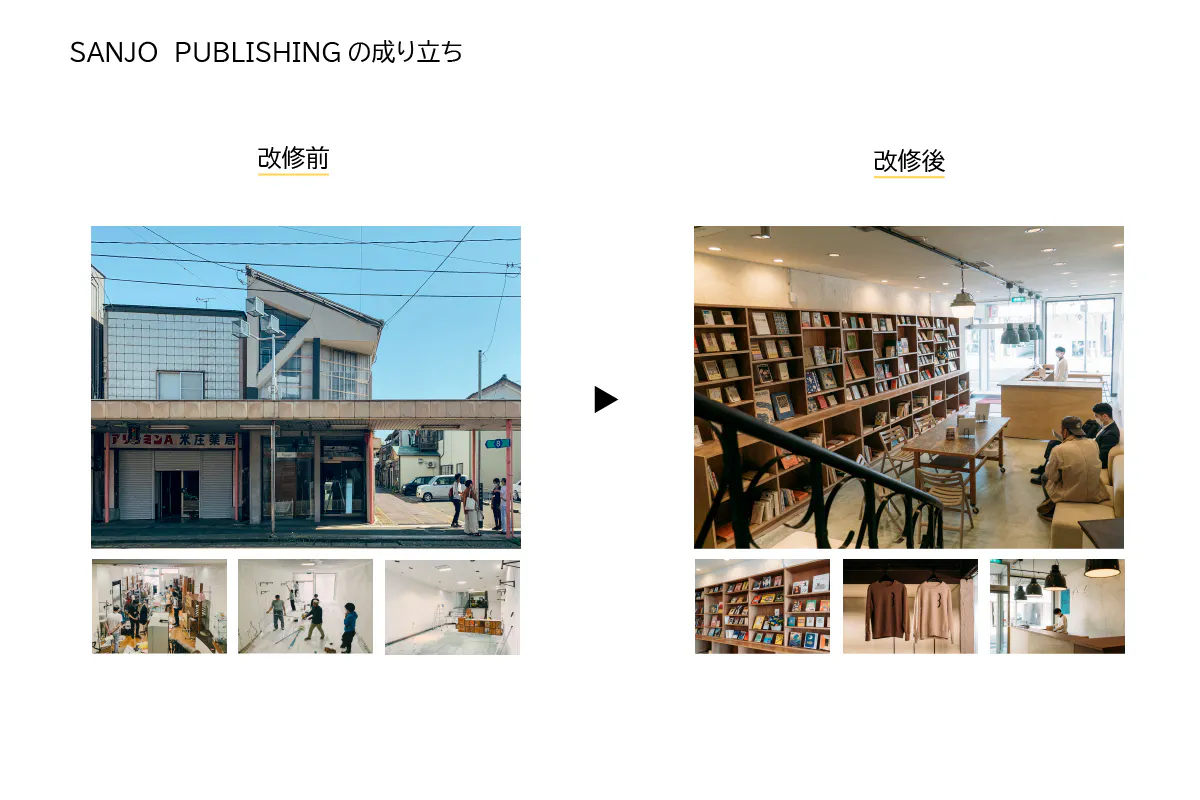 この度、SANJO PUBLISHINGではコンセプトである『まちを編集する』を実現するための第一歩として、『本を作れる本屋』プロジェクトを始動します。このプロジェクトの発起人である私は2020年に新潟県にUターンし、新潟県三条市の中央商店街で、SANJO PUBLISHINGの立ち上げ、本屋と喫茶店を営みながら、「まちの編集室」の準備を進めてきました。