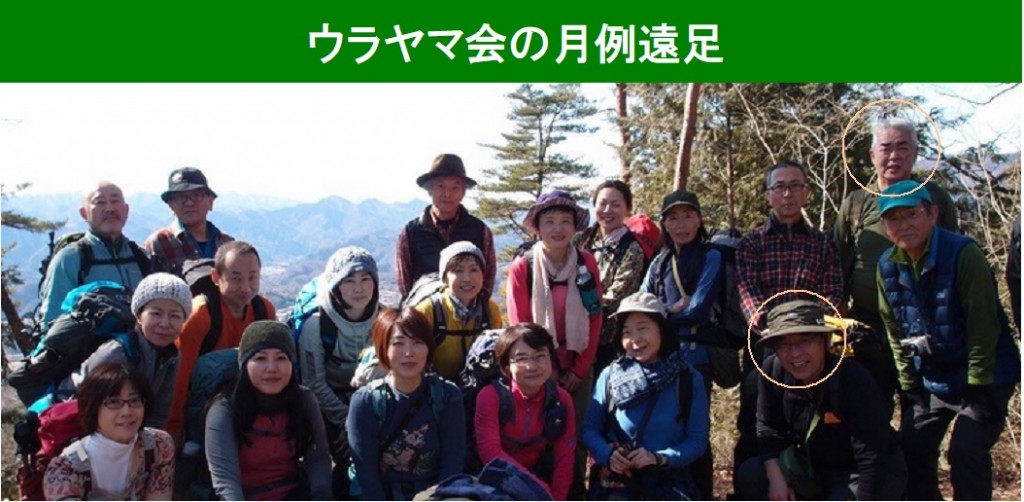 ウラヤマ会では、遠足と称する山歩きを月1回楽しんでいます。会費というものは無く自前の手弁当と交通費だけで、下山すると温泉に浸かり希望者は反省会というささやかな宴に参加催し解散となります。