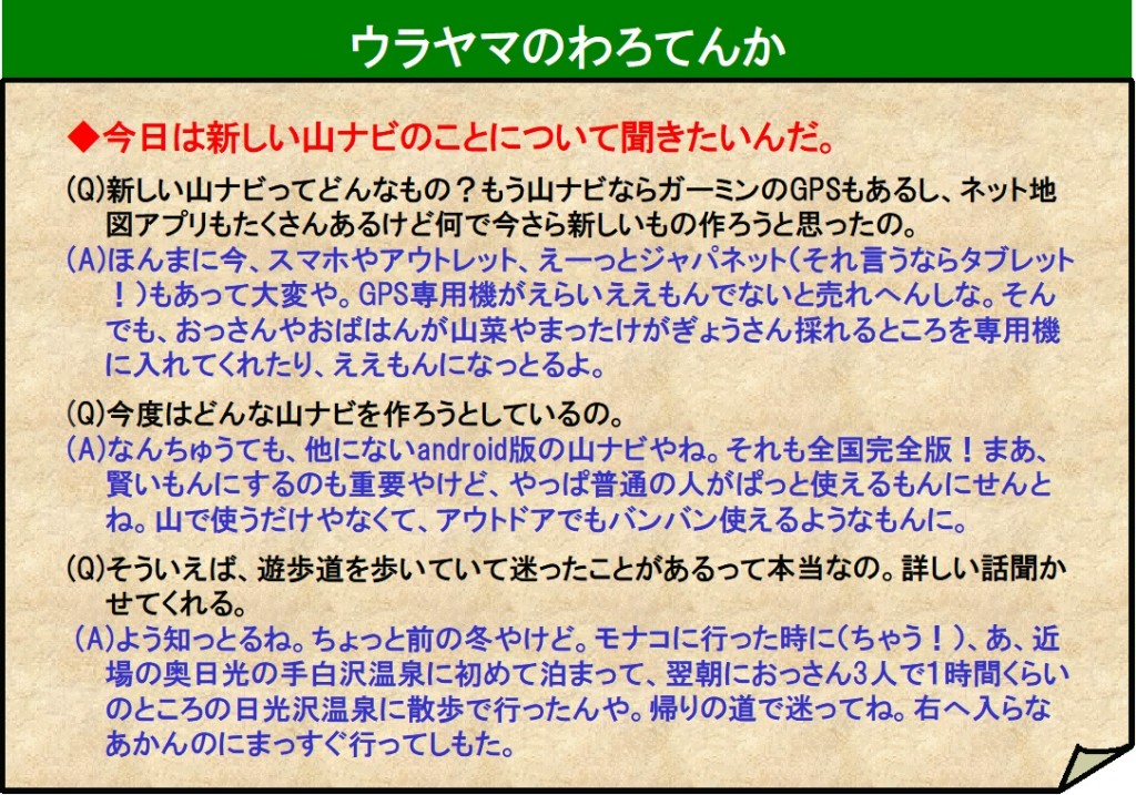 ウラヤマ会メンバーによる実際にあった道迷いのエピソードを紹介します。Qさんは東京出身(つっこみ役)、Aさんは関西人という設定です。
